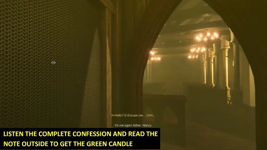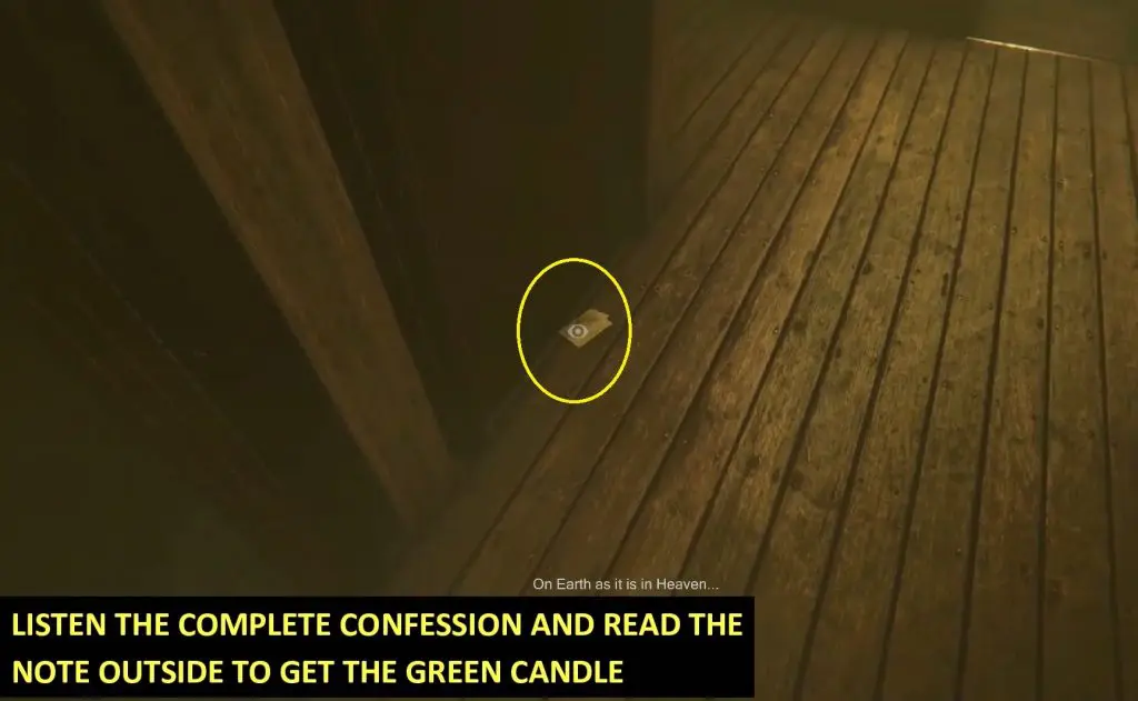 Again, go to the main church area. This time listen to the complete confession. Read the note lying on the floor to spawn the green candle in the middle of the main church hall.