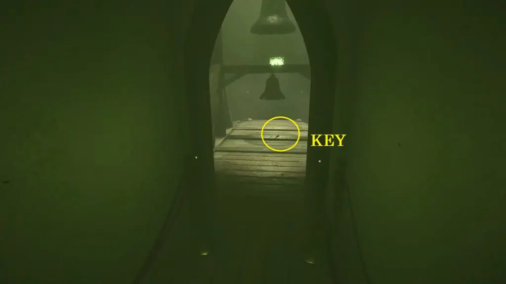 Once all 4 candles are placed under the portraits, return to the bell tower to collect the key lying on the floor.
