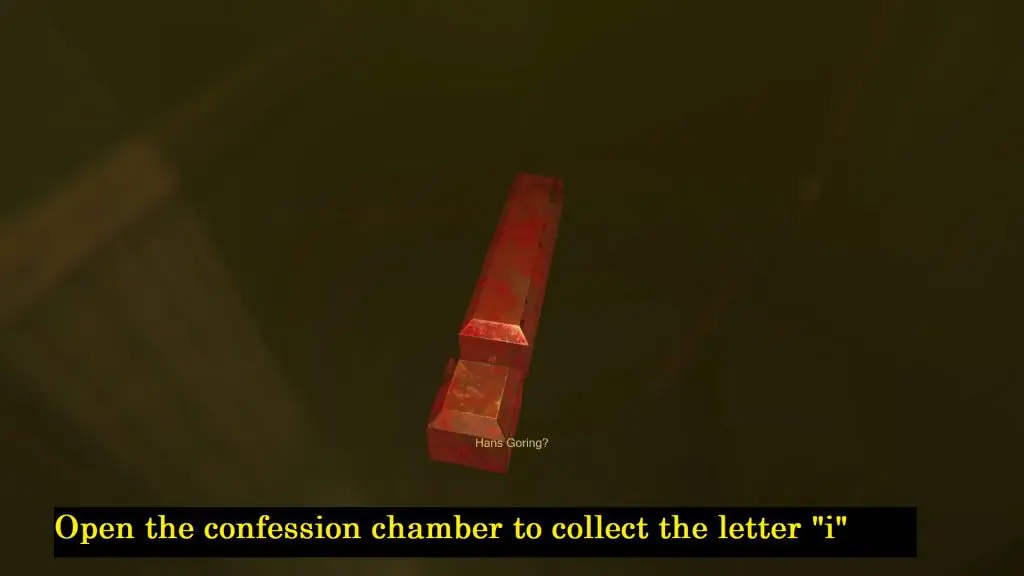 Time travel to 1951 and open the confession chamber with the key. Collect the letter “i” from the chamber.
