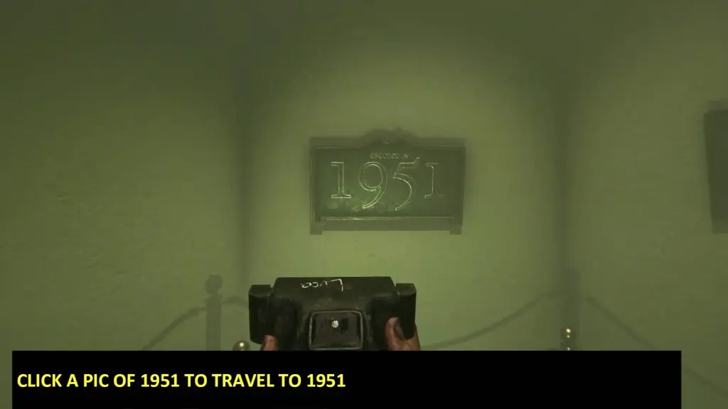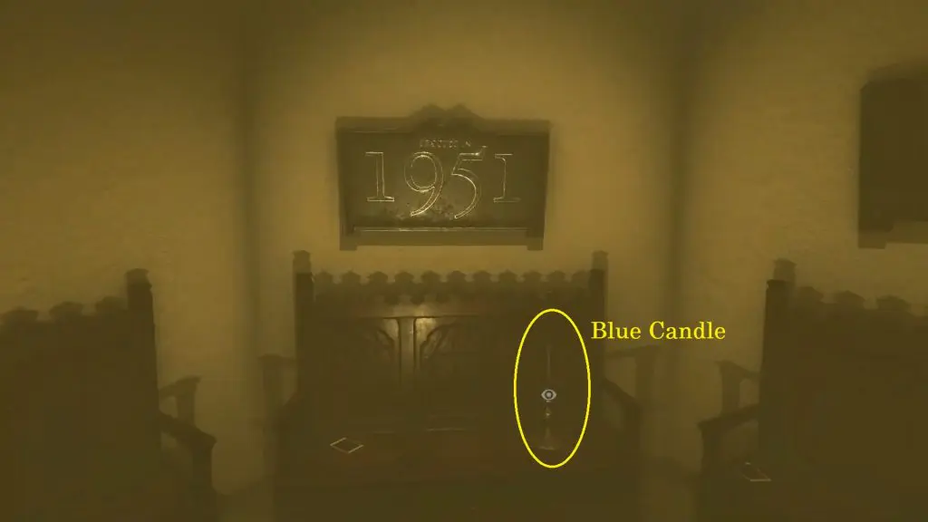As you snap a photo, you will time-travel to the year 1987 and the layout of the room will change. You will see 2022, 1987, and 1951 signs on the wall. Now take the picture of 1951 and collect the violet (blue) candle from the bench.