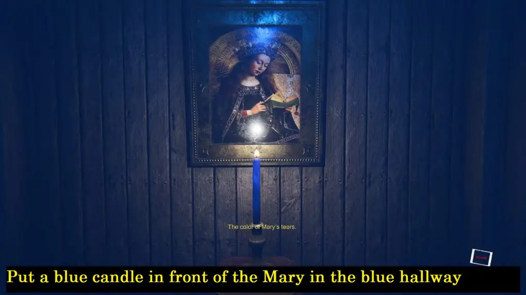 Again, go to the main church area. This time head to the blue (violet) color maze (hallway) on the right. Place the blue candle on the pedestal in front of Mary’s photo. As shown below image.