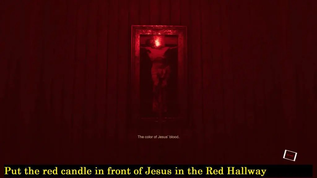 Head back to the main church area. Go to the back side of the main church area behind the sitting area. This time heads to the red color maze (hallway) and put the red candle in front of Jesus’ portrait.