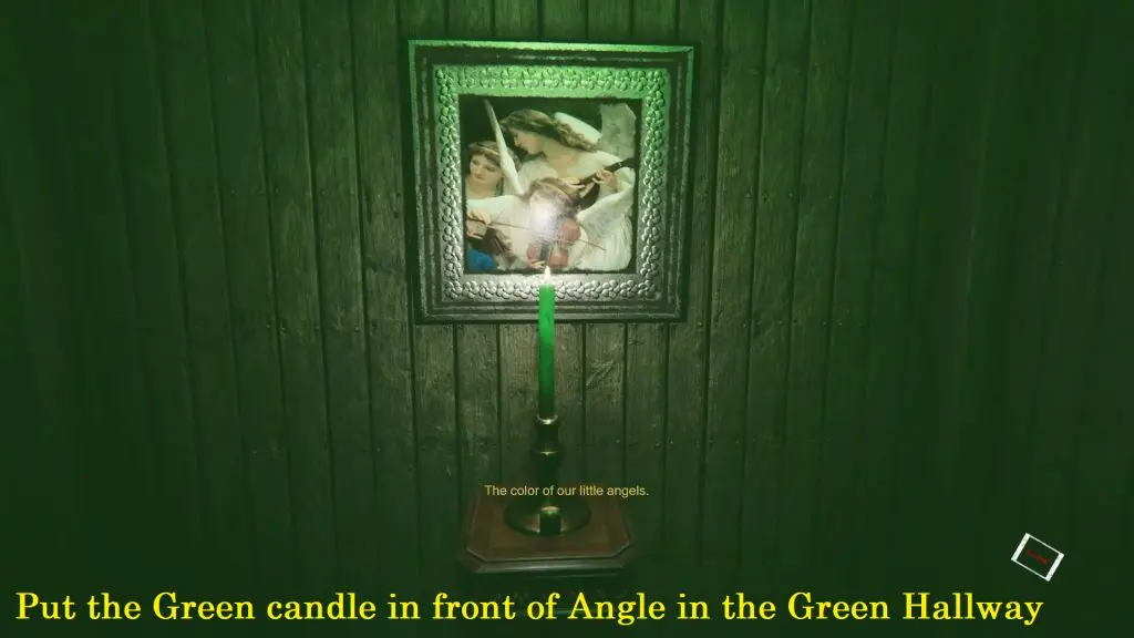 Next, go to the green color maze (hallway) and put the green candle in front of Angles’ portrait.