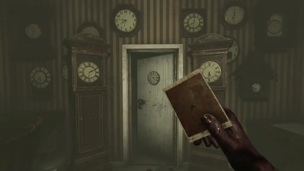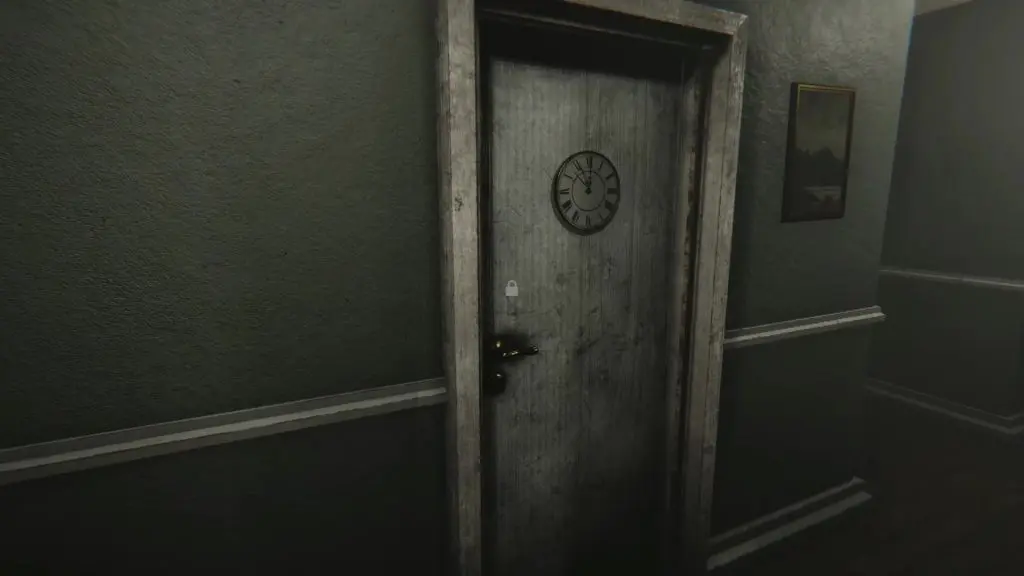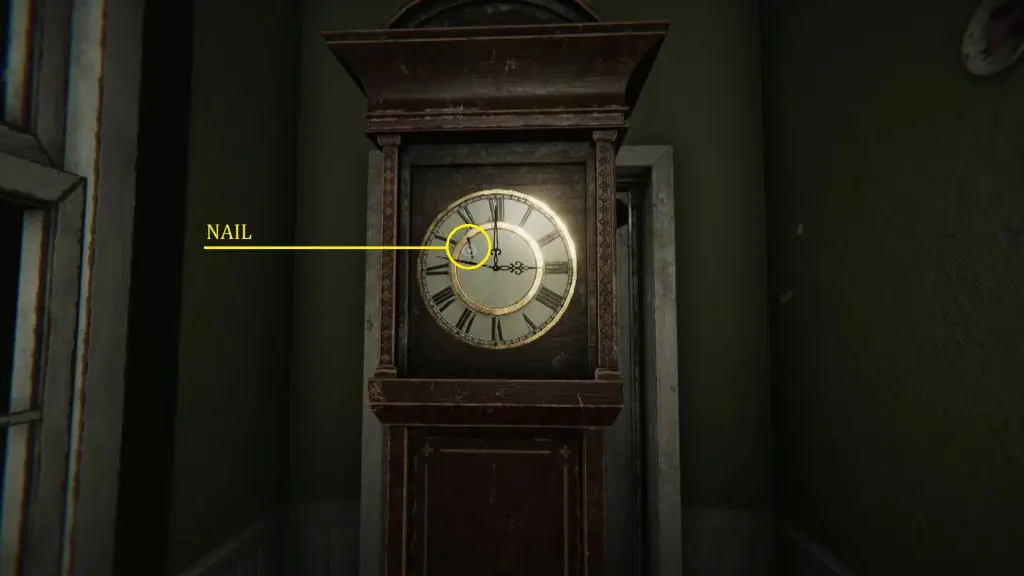 There are total 9 clockpieces in the house that will help you solve the puzzle (1 in Green Safe, 1 in the corridor outside Grandpa’s office, 1 in the attic, 1 in the kitchen, 1 in the hallway outside the ritual room, and 4 in the clock room). After you have solved the puzzle, click a photo of the door in the clock room as shown in the picture below. This will give you the third digit of the code. Enter the room and collect the Unfinished Clock hanging inside.