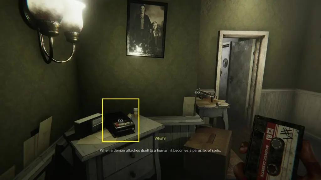 Get out of the ritual room and collect Cassette #3 kept on the window as shown in the picture below. Go to the main hall and play the Cassette. After you are done listening, Luca will have another episode and he will draw Horns in the notebook.