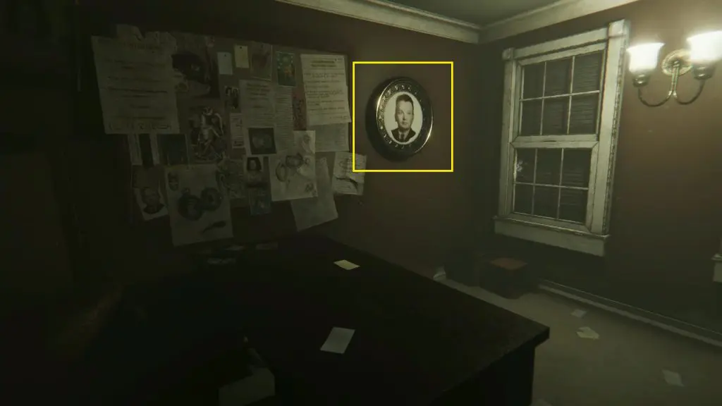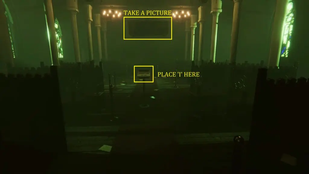 Once you have solved all the four mazes, travel to 1987 and go to the bell room. There you will find the Confessionary Key under the bell. Pick up the key and then travel to 1951. Use the key to open the confessionary. Inside the room, you will find a nameplate. Interact with the nameplate and collect the Letter ‘I’ from it. Now travel back to 1987 and place the letter I on the podium as shown in the picture below. Then click a photo of the coffin as shown in the picture below. This will make the coffin fall down. Collect Madison’s Skull dropped from the coffin.