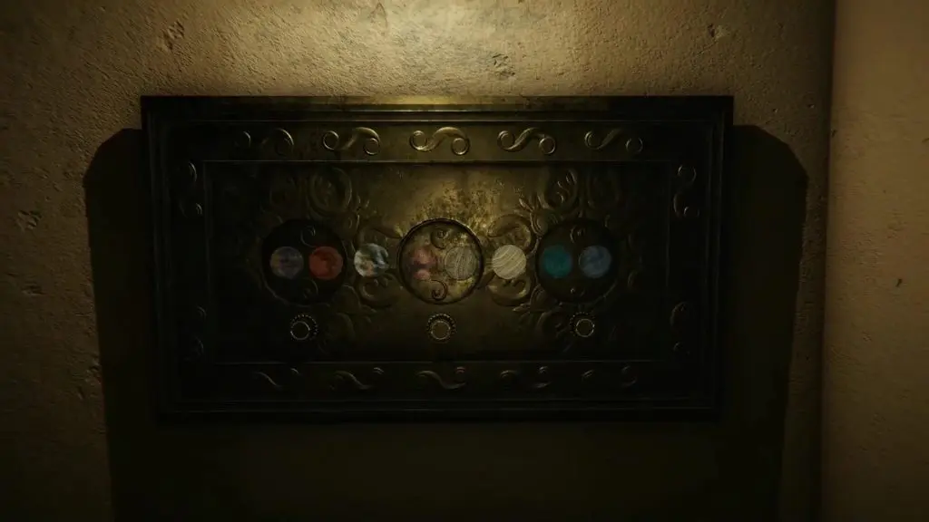 If you followed this guide correctly, you will now be having three Solar Medallions. Go back to Grandma’s room and go to the Puzzle Panel in the small room connected to it. To solve the puzzle, you need to insert the medallions and arrange the planets in the same sequence as revealed in the photo that you clicked in the projector room. The picture below shows the correct sequence of the planets in my game. This sequence changes from game to game. So, you will need to do this yourself based on what planet order you have in your photo.