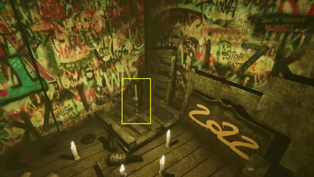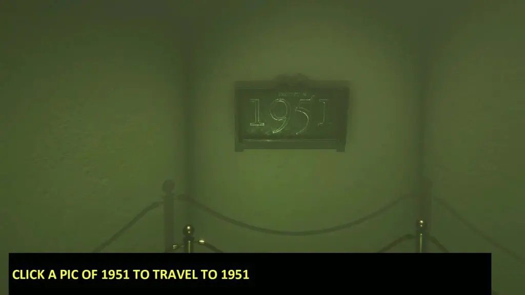 After collecting the candle, go through the door and you will reach a small room with the number 1987 written on the wall. Take a photo of the number 1987 and you will time travel to the year 1987. Here you will see three numbers (1951, 1987, & 2022) written on the wall. Taking a photo of the number on the wall will make you time travel to that year. First, take a photo of 1951 to reach the year 1951 as shown in the picture below. Pick up the Blue Candle kept on the chair there. Then go out of the room and enter the cathedral.