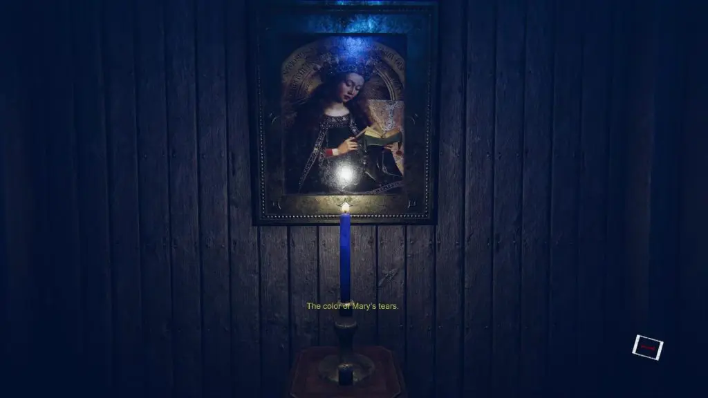 After entering the cathedral, go straight ahead and go through the door on the opposite side. Here you will see two pictures with planks in front of them giving hints about the candle that goes with the painting. Now go back to the main hall of the cathedral. Here you will find four mazes. Enter the yellow maze and continue until you reach a small room with three tables kept in front of three paintings. Place the yellow candle on the table in front of the painting shown in the picture below. If the correct painting is not there, that means you need to time travel to a different year to solve this maze.