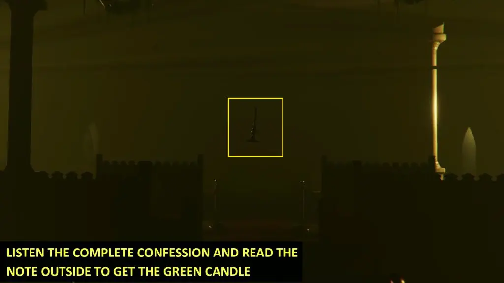 Go back outside and listen to the confession of the woman inside the confessionary. After the confession is complete, pick up and read the note outside the confessionary door. This will make the Green Candle appear mid-air in the cathedral. Pick it up.