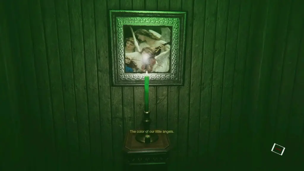 Enter the green maze and continue until you reach a small room with three tables kept in front of three paintings. Place the green candle on the table in front of the painting shown in the picture below. If the correct painting is not there, that means you need to time travel to a different year to solve this maze.