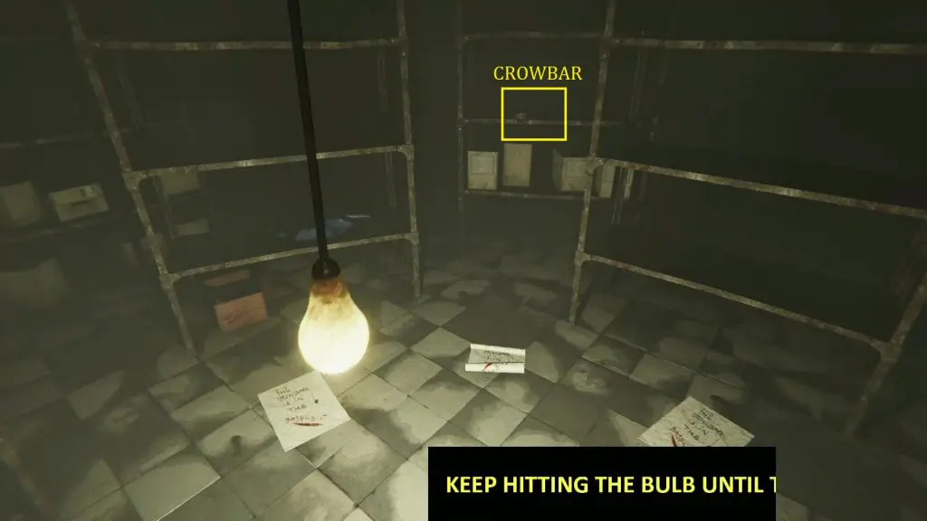 Go to the basement and use the key to open the red door. Go through it to reach a small room. As you enter the room, the light will go out. When the light comes back, you will see that the arrangement of the shelves in the room has changed. The light will start flickering and the arrangement of the room will keep changing until it stops at one particular arrangement. Hitting the bulb at the center of the room will change the arrangement of the shelves. Keep hitting the bulb until the red storage safe appears. Hit the bulb again and a new arrangement of the shelves will appear. This time you will find the crowbar on one of the shelves as shown in the picture below.