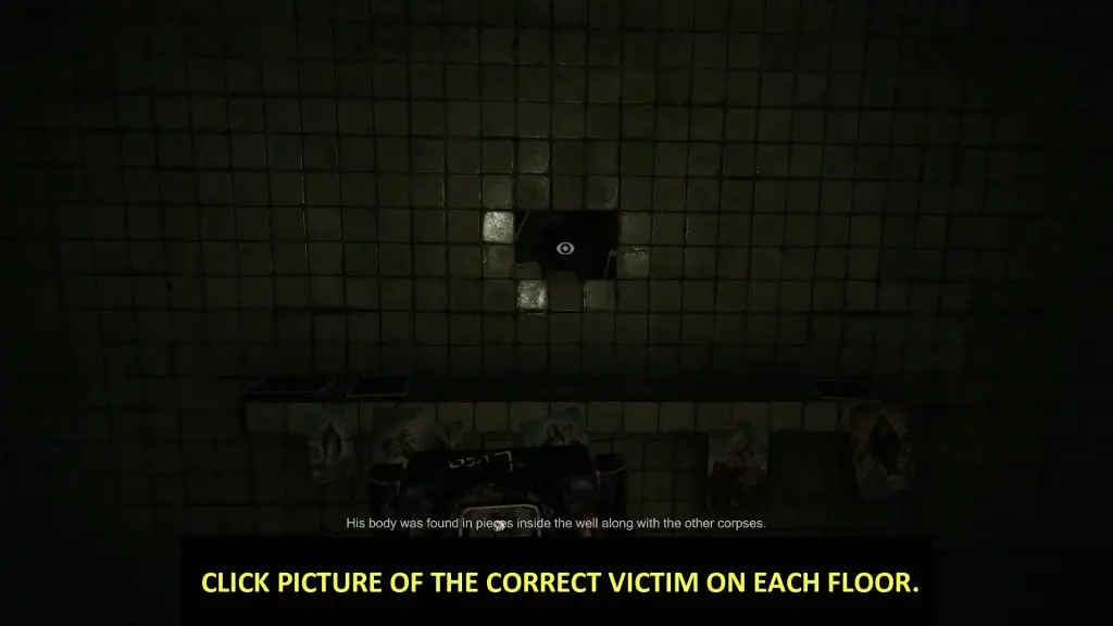 In the Morgue, there will be 5 floors. You need to take a photo of the correct victim on each floor to solve the puzzle. The detail of the victim will be announced on each floor. Listen carefully to correctly identify the victim. The nameplate of the victim is always behind the hole in the wall as shown in the picture. You will need a hammer to open some of these holes. Look through the hole to see the nameplate. When you have identifies the correct victim, click a photo of the wall. The name of the correct victim on each floor is shown below.