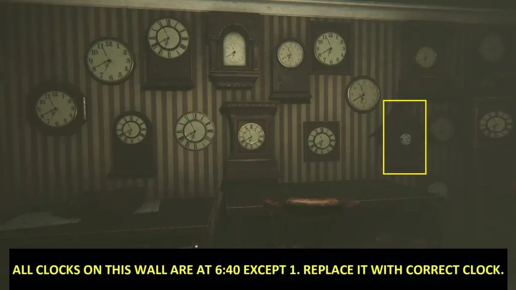 Go back to the clock room. Here you will notice that all the clocks on a wall have the same time except for one. You need to replace this clockpiece with the correct one. For example, in the below picture, all the clocks are at 6:40 except for the one marked with a yellow rectangle. You need to replace this clockpiece with another clockpiece at 6:40. Do this for all 4 walls to complete the puzzle.