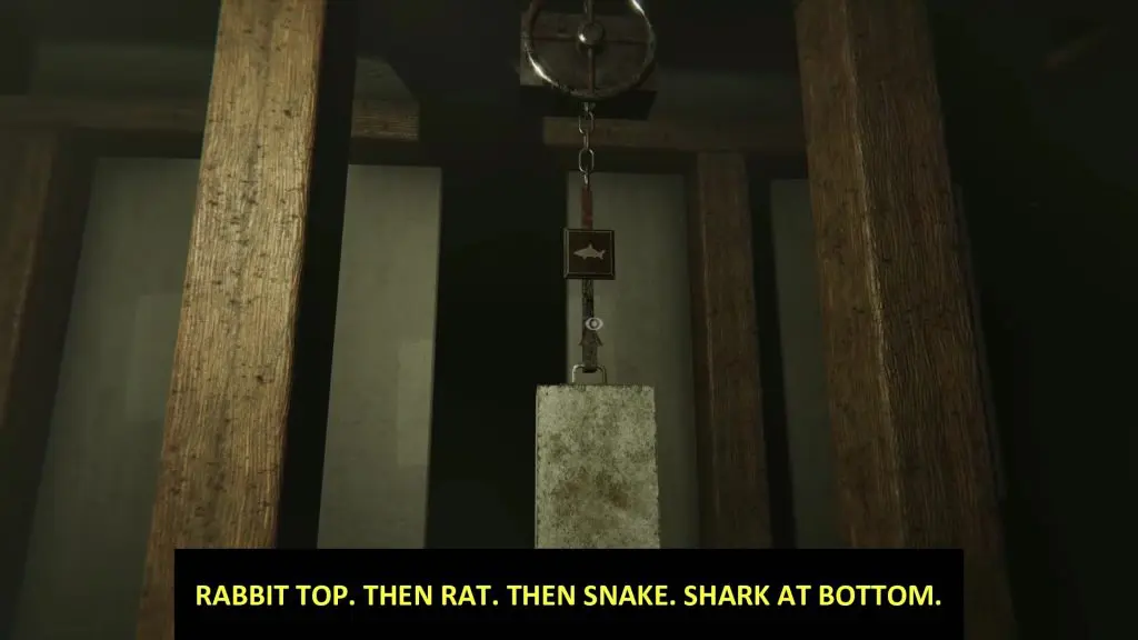 To solve the puzzle, you need to hang the weights in such a way that the animals drawn on the lever are in the positions mentioned in the story on the blackboard. Put the highest weight on the Shark as shown in the picture below. Place the next highest weight on the snake. Put the concrete block that you collected from the toilet on the rat. Place the unfinished clock on the rabbit. Now clock a photo of the cage. This will open the cage. Pick up the book inside and read it.