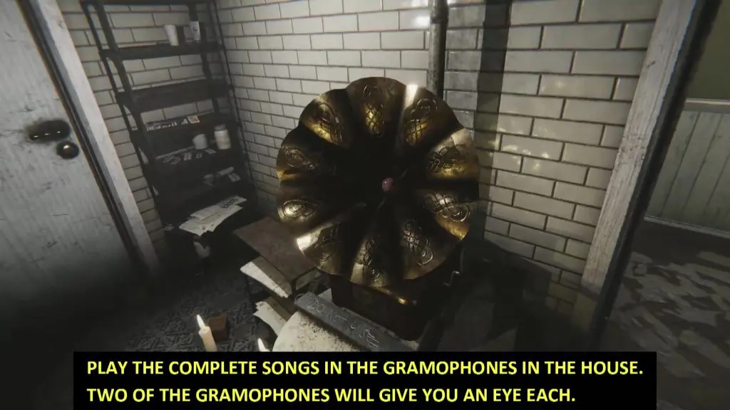When you put down the book, you will see that Johnny’s room has changed, with a hole on the floor at the center of the room. Click a photo of the hole and the door of the room will open. Go out of the room and you will find various gramophones in the house. Two of these Gramophones have an eye inside them. You need to play the full song on the gramophone to get the eye. The gramophone containing the eye is decided randomly by the game. You need to keep playing all the gramophones until you get the two eyes. Once you have the two eyes, go back to Johnn’s room and throw them inside the hole on the floor. Then take a photo of the hole to get the fourth digit of the code. At this point, you will be attacked by a monster.