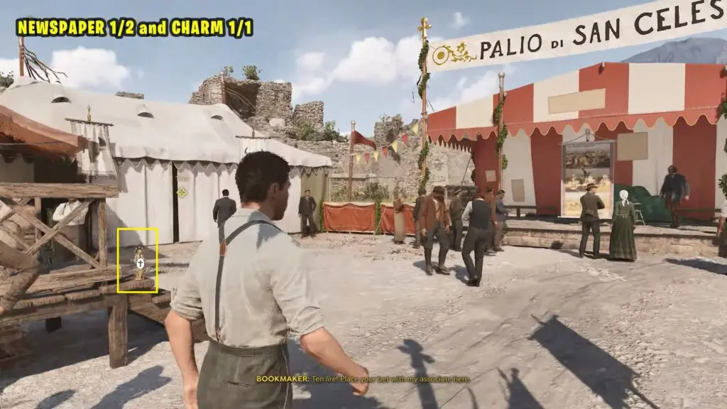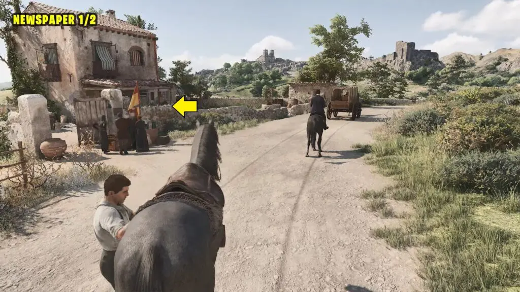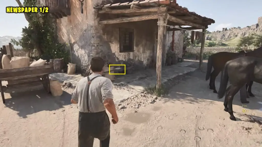 Follow the main story where you ride a horse with Luca. The Newspaper is on a stone bench in front of a building at the marked location. If you reach Paquale’s Store, you’ve gone too far.