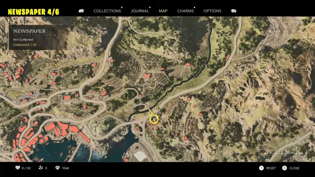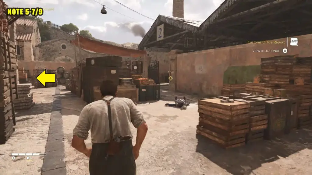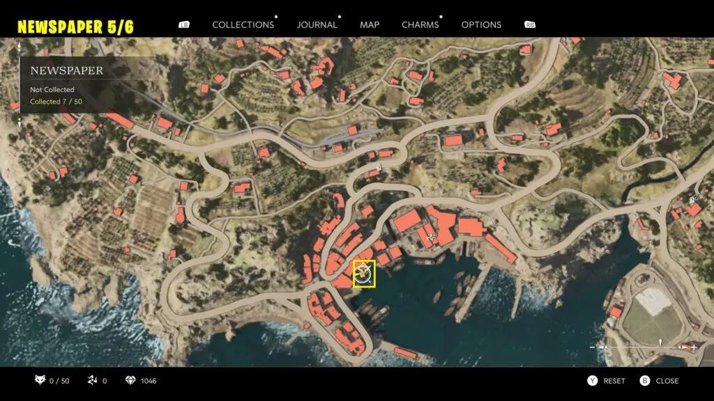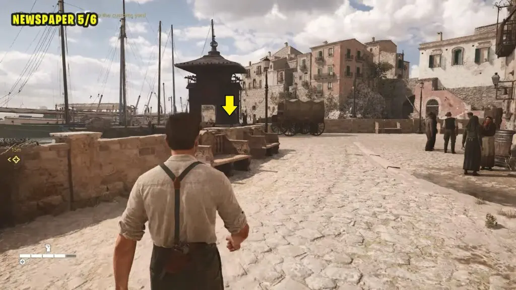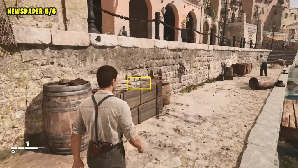 Follow the main story until you reach the customs yard with Leo and Caesar in Porto Almaro. Then, head to your left and go down the stairs to the dock near a cart. You’ll find a newspaper on top of the cart beside the wall.