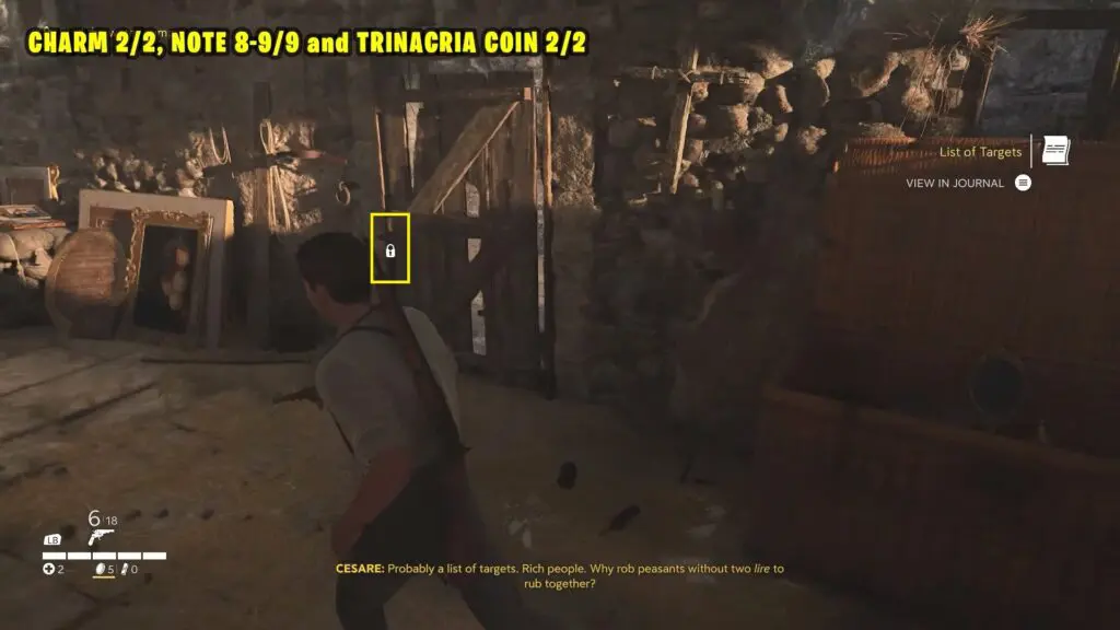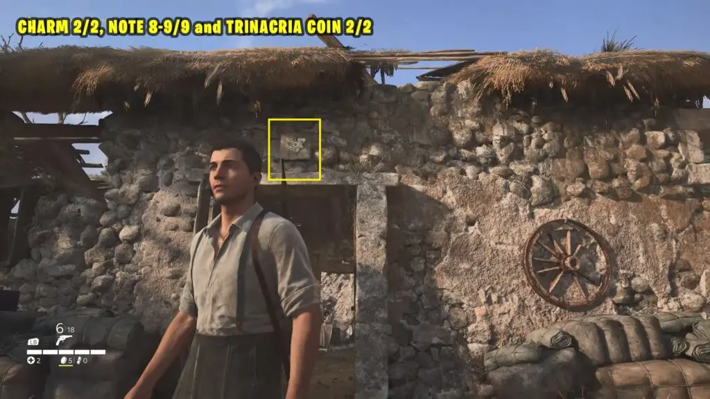 Look for a locked door in the room. Break the lock with your knife and go through the door. Turn around to find the Trinacria Coin on top of the door frame.
