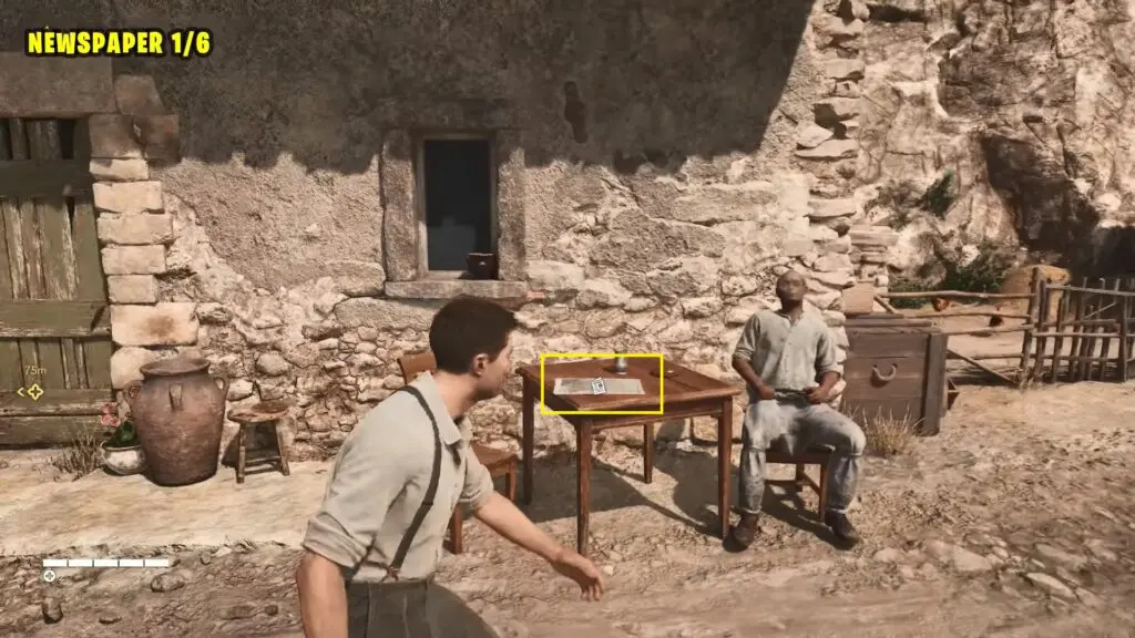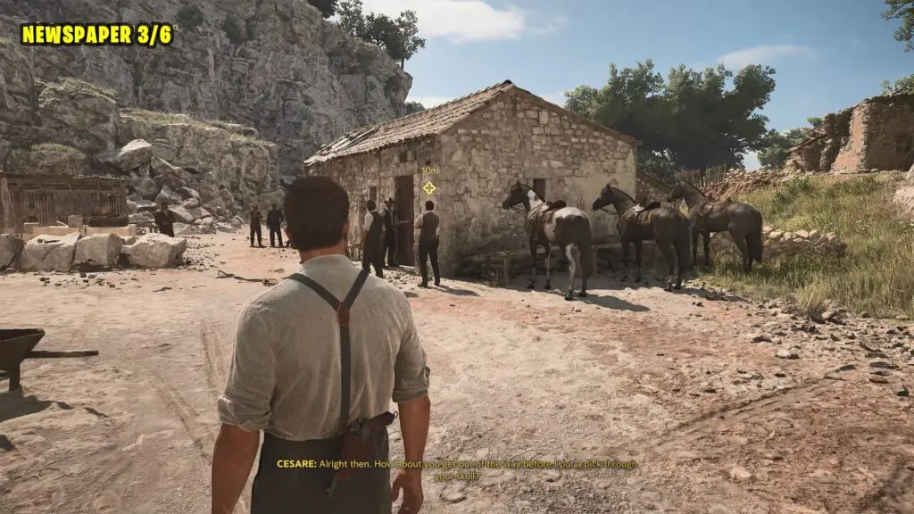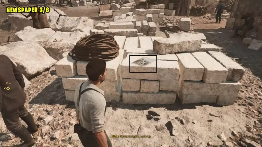 Follow the main story and ride the horse with Luca and Caesar to reach the quarry. You’ll find a newspaper on top of a stone slab in front of the hut.