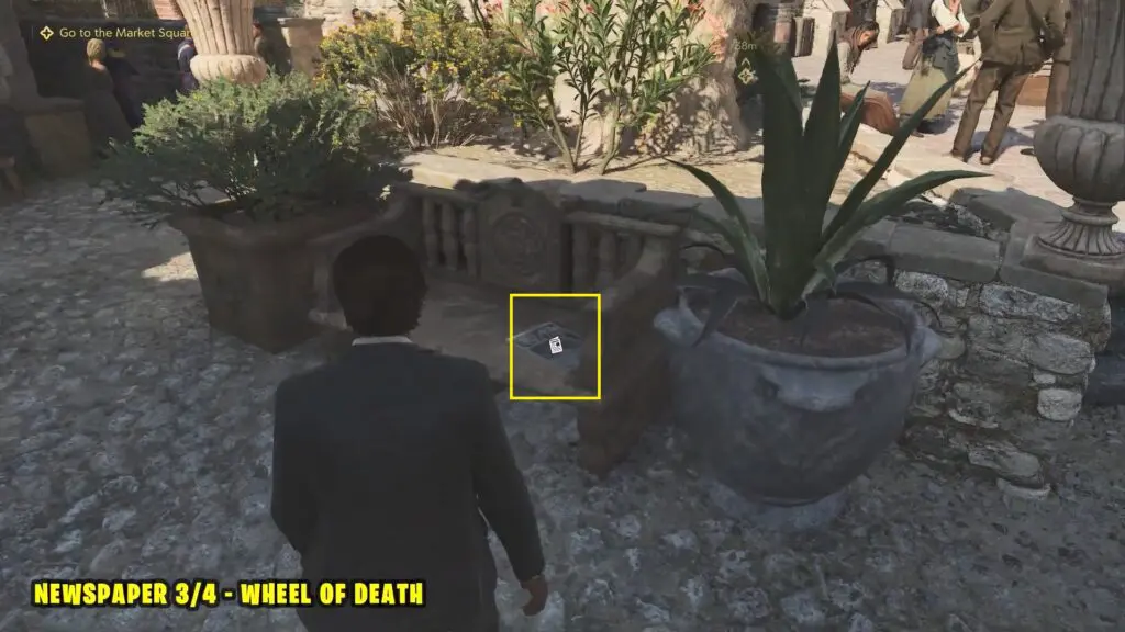 As you proceed toward the objective marker, go up the stone stairs and then proceed to the left side to find the newspaper on a stone bench.