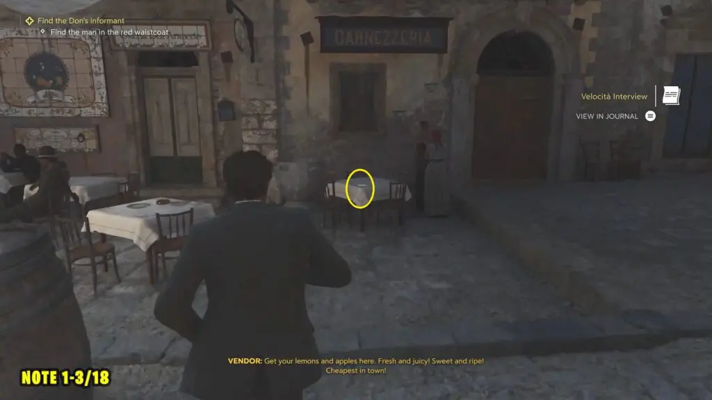 In the Market Square, you’ll find the Note – Velocita Interview on a crate inside a small tent shop near the stairs.