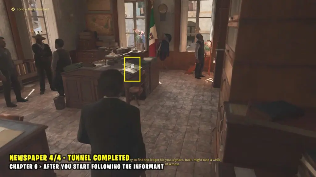 Proceed to the “Follow the Informant” objective. He will lead you into an office in the marketplace, where you’ll find Newspaper 4/4 on the table in the first room.
