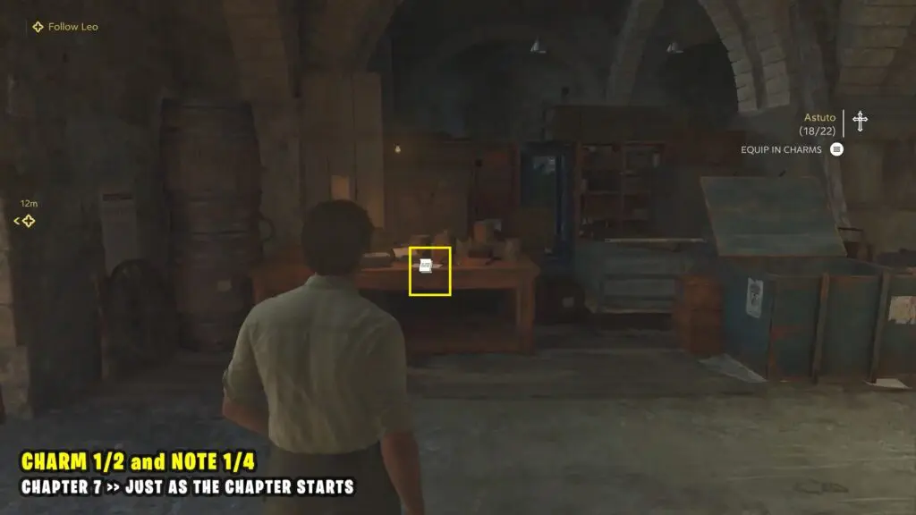 Charm #1 and Note #1 are available at the start of the chapter. The charm is on a table to the left, and the note is on the right side.