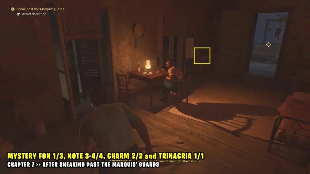 Leave the room through the balcony and jump onto the lower roof to reach the next room on the left. Inside, you’ll find Charm #2 and Trinacria 1/1.