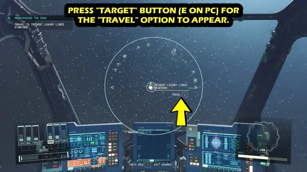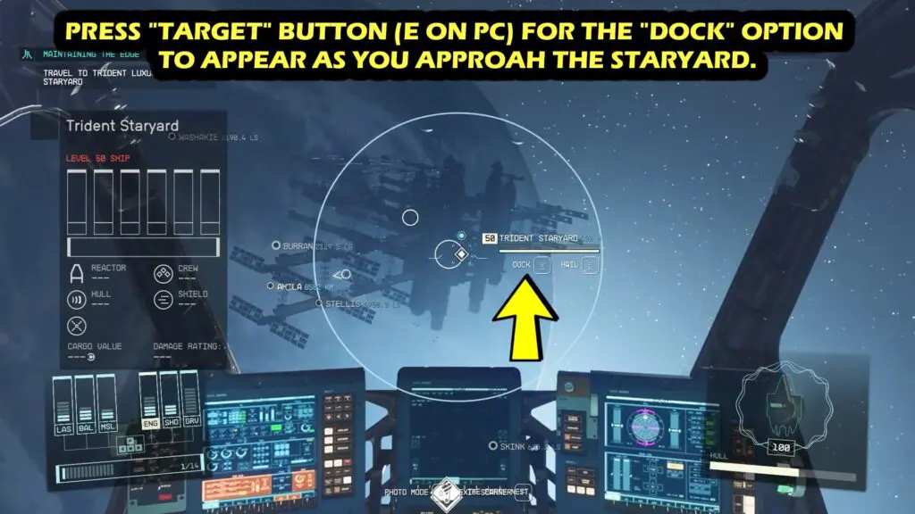 Once you reach the Cheyenne System, start the process of docking. First aim towards the Target ship which is Trident Luxury Lines StarYard and press the ‘E’ key to make the selection. If the Ship’s name appears on your screen then you have selected the ship successfully. If not then you have to do the selection again.