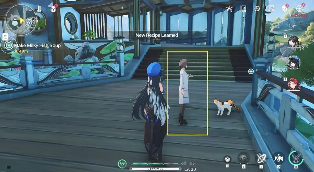 Go left at Resonance nexus in Jinzhou and talk to the mysterious woman with a cat as shown in the pictures below. Talking to her will start the “Listen to Animals Words: Translation of Cat’s Language” quest and you will get the Milky Fish Soup recipe.