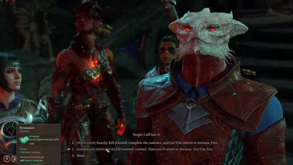 “[Barbarian][Persuasion] Kill yourself, coward. Then you’ll return to Avernus. You’ll be free”