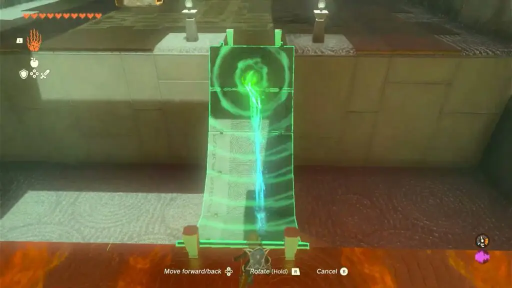 Upon entering the shrine, proceed straight ahead until you reach the gap. Stand on the edge and use Ultrahand to grab the bridge panel. Pulling up one panel will bring the rest up with it. Attach the panel to the other side of the gap to create a bridge, and cross it.