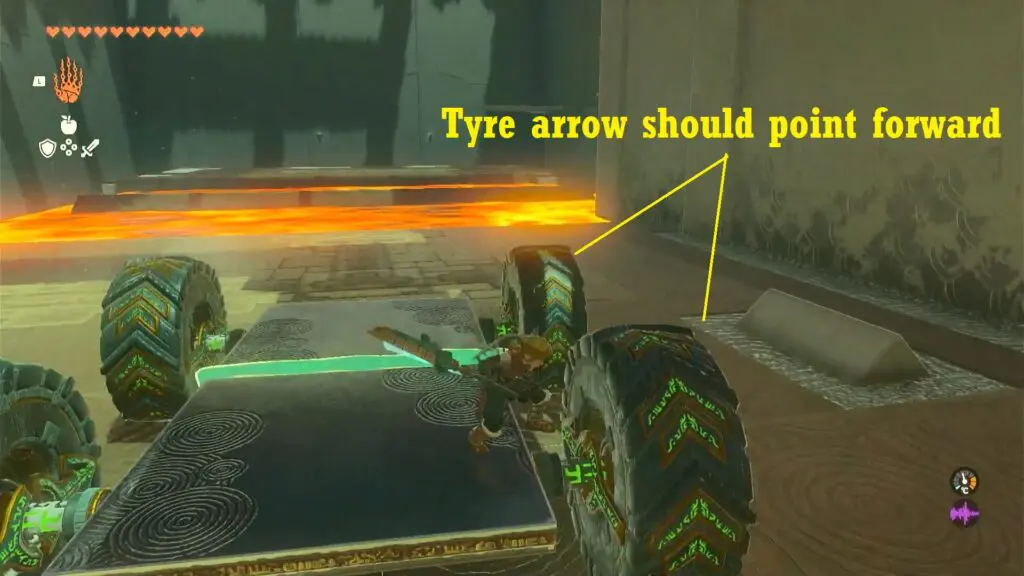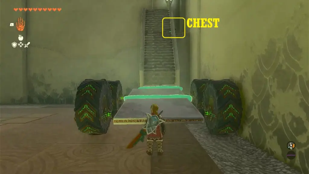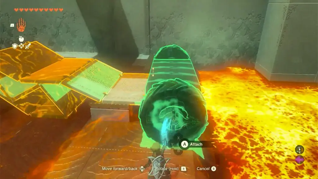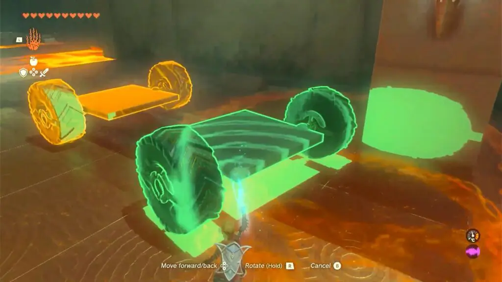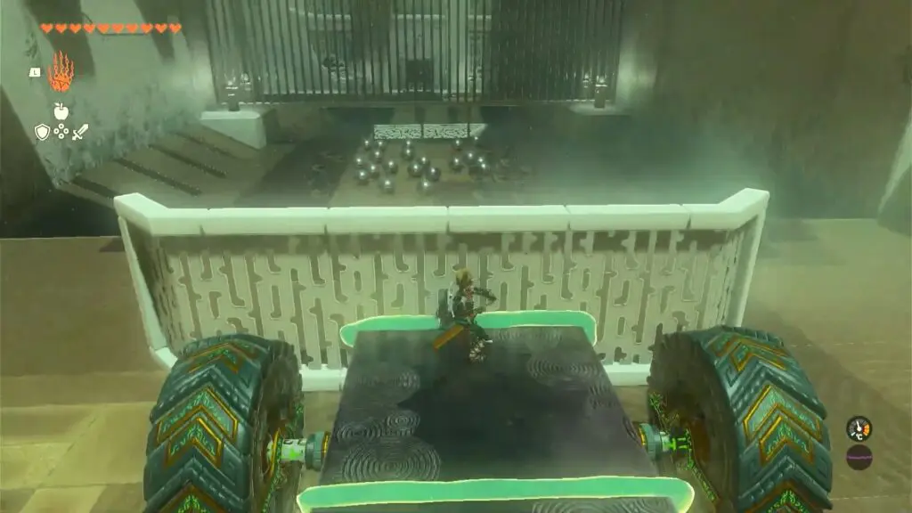 In the following area, you will encounter a wheeled mechanism and a stack of bridge panels. Take the wheel mechanism and use Ultrahand to attach it to the front of the pile of panels.