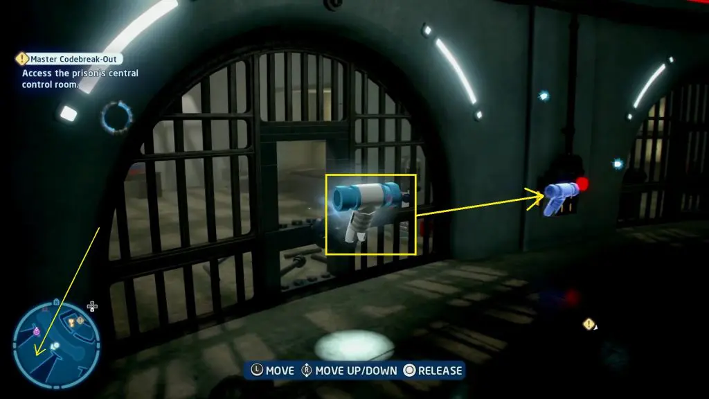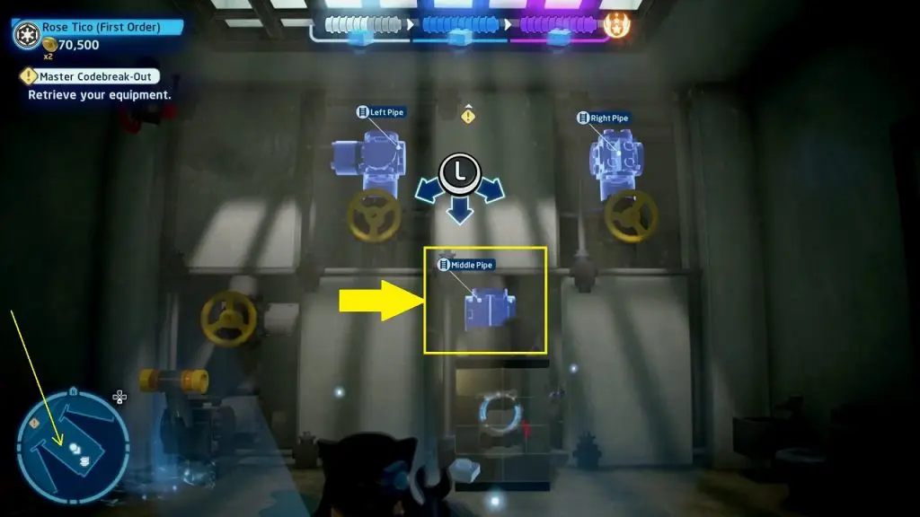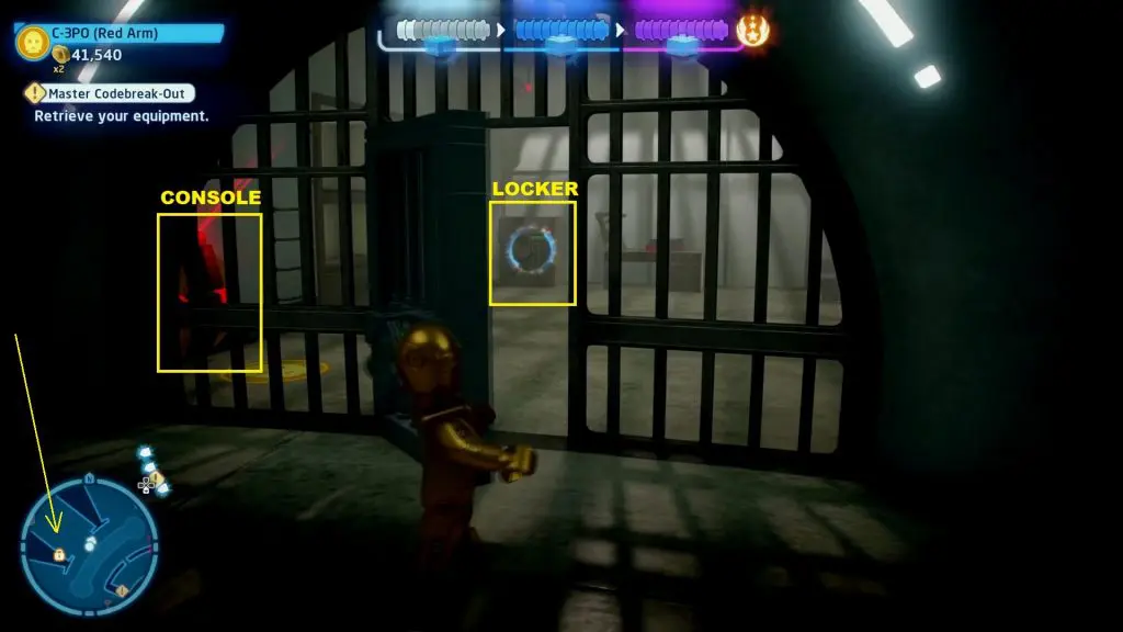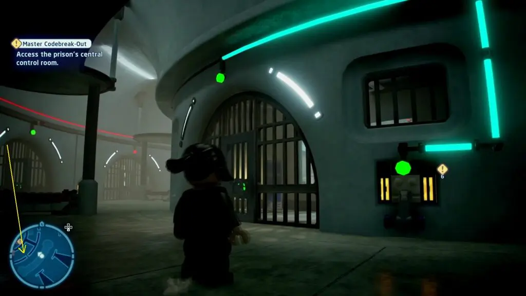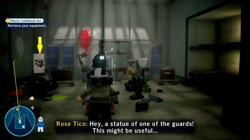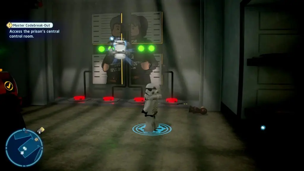 Go to the southeastern cell on the inner circle as shown in the minimap below. Pull the lever to open the cell and go inside. Break the items inside the cell and build a cutout of Finn and Rose. Then pull the lever next to the cutouts, which will make the cutouts dance. Guards will come out to check what’s happening inside the cell. When they go inside the cell, pull the lever to close the cell and the guards will be locked inside.
