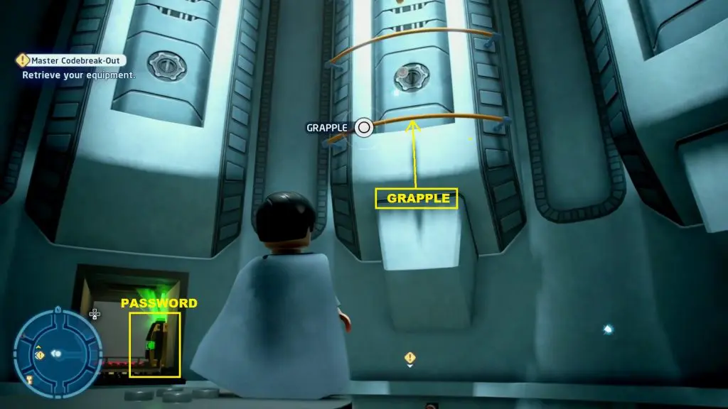 Go to the central room and use the trampoline to jump to the top of the pillar at the center of the room. Then get the Canto Bight Prison Safe password from the C3PO terminal as shown in the picture above. Now go to the northwestern cell on the outer circle as shown in the minimap below. Use the password on the console inside the cell to open the safe as shown in the picture below and get the Minikit.