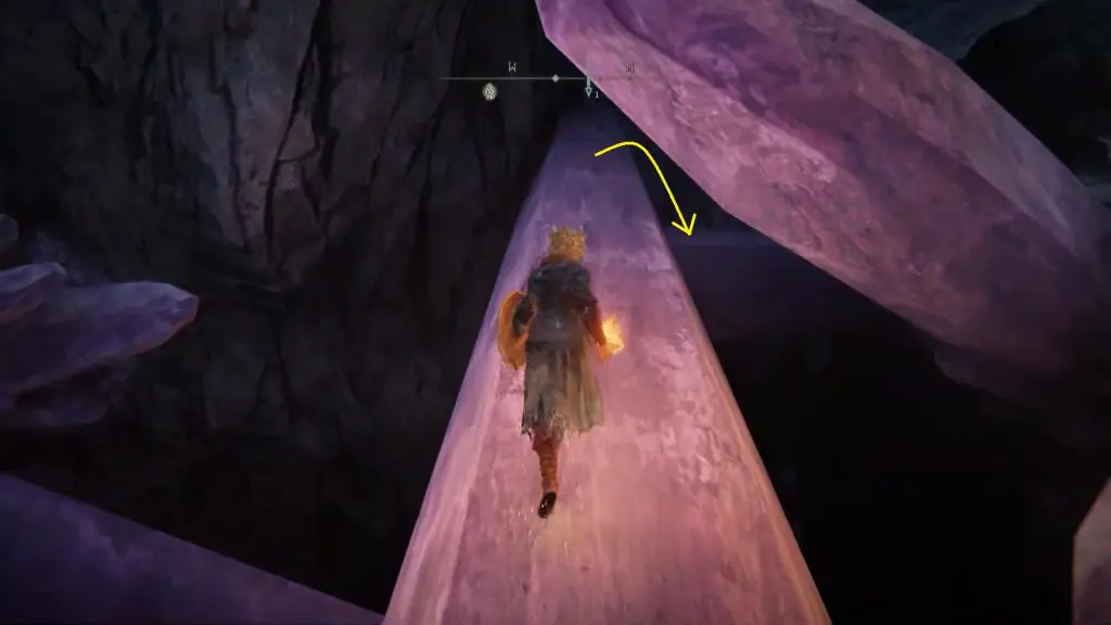 Go inside the cave, and when the cave end hit the illusionary wall to reveal the path further ahead. After two illusionary walls, you will reach an area with long purple crystals. The objective here is to go to the bottom level. Walk till the end of the first crystal and jump down on the crystal on the right side as shown below.