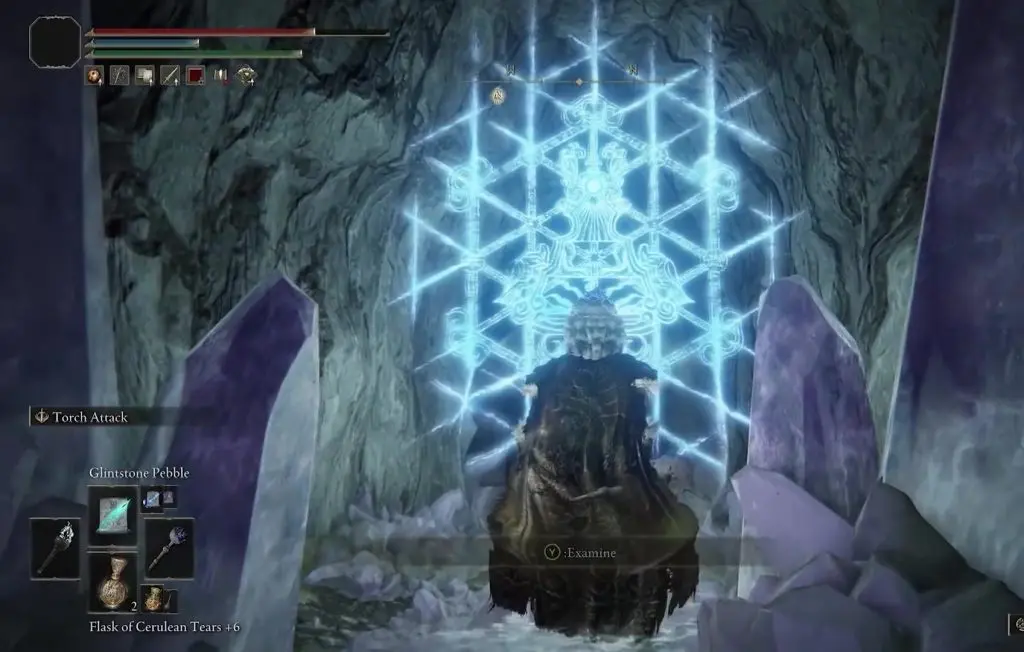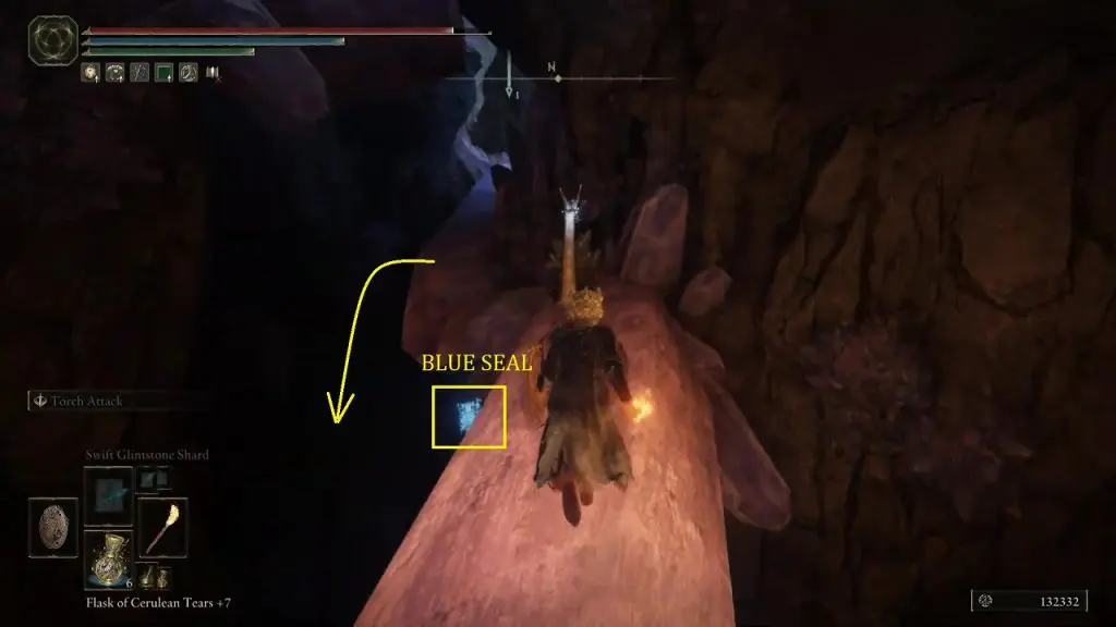 Then walk straight and jump down on the crystal on the left side below. Here you will see a blue seal down below as shown in the picture below. Jump down here to reach the bottom level.