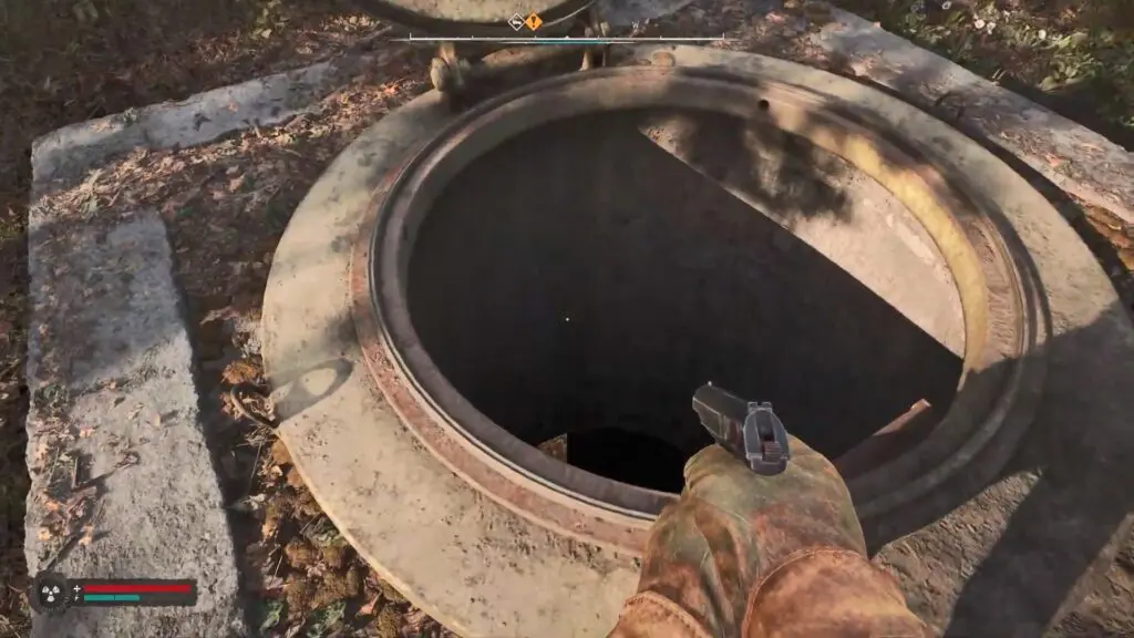 From the checkpoint, head to your right side and walk along the wall to locate an open hatch on the ground.
