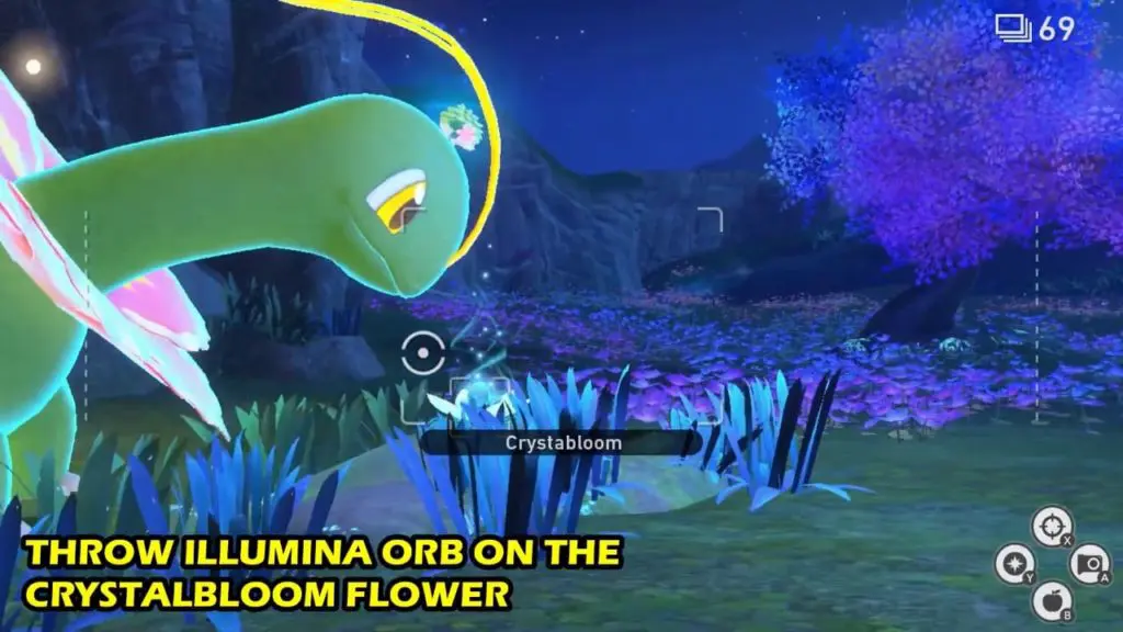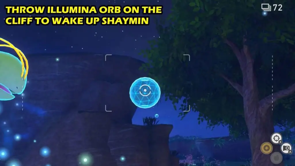 Now, Head to Illumina Spot in Florio Nature Park, it’s home to the Illumina Meganium. Throw Illumina orb on the cliff on the left side to wake up Shaymin. Shaymin will hop up on the head of Meganium.