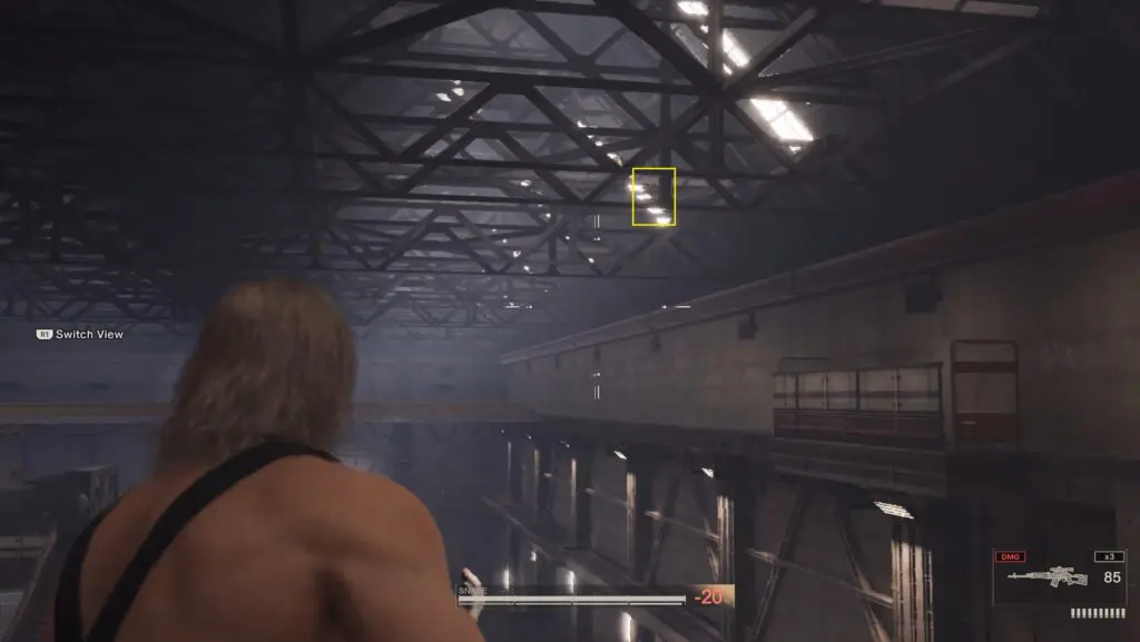 Once inside, go up the stairs right in front of you. Walk past the console, then turn right and look up at the roof. You’ll spot Ga-Ko sitting on one of the support beams above.