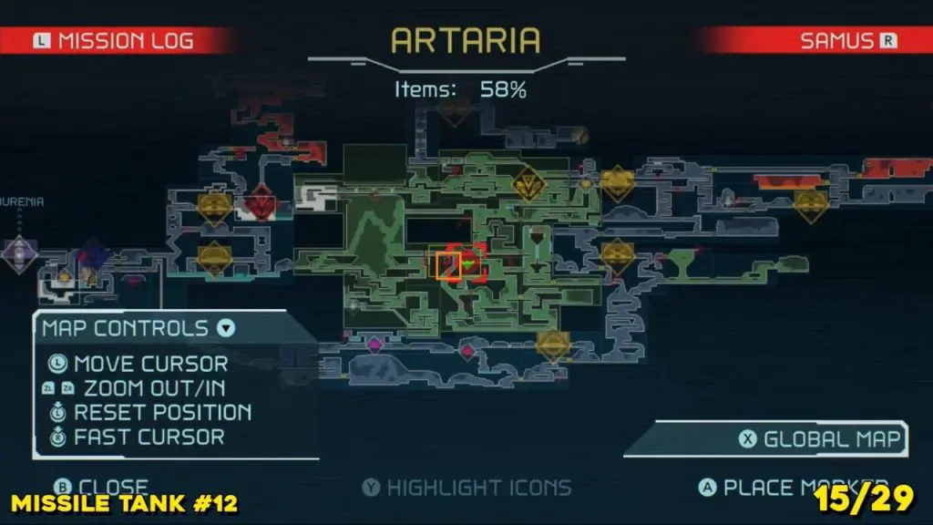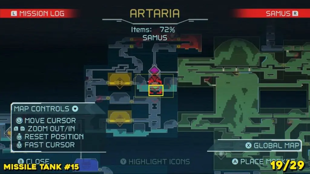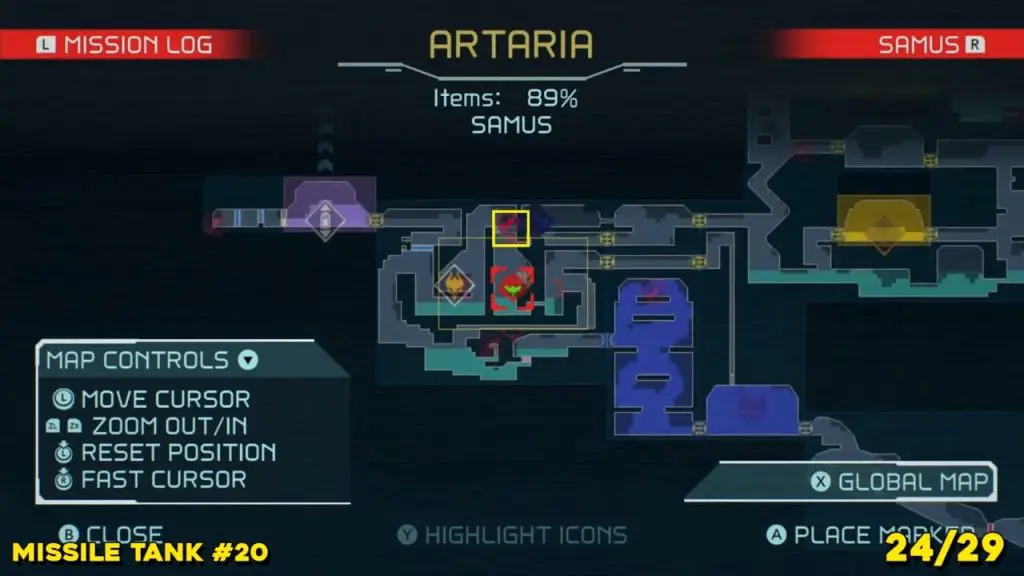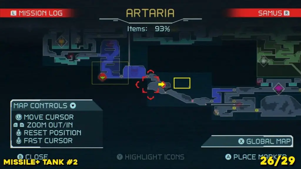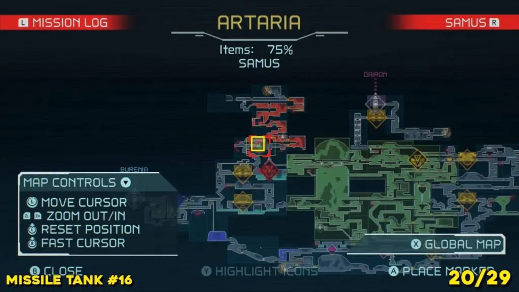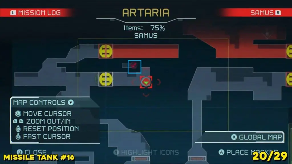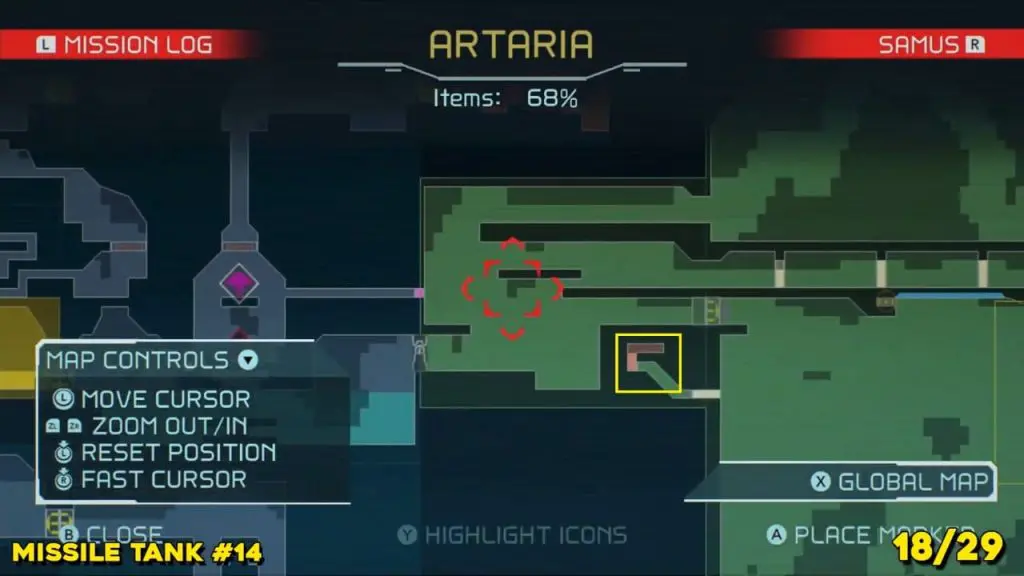 Located in the middle of Artaria’s now green E.M.M.I zone as pointed on the map. This Missile tank is behind a magnetic barrier. Use a grapple beam to lift the barrier.