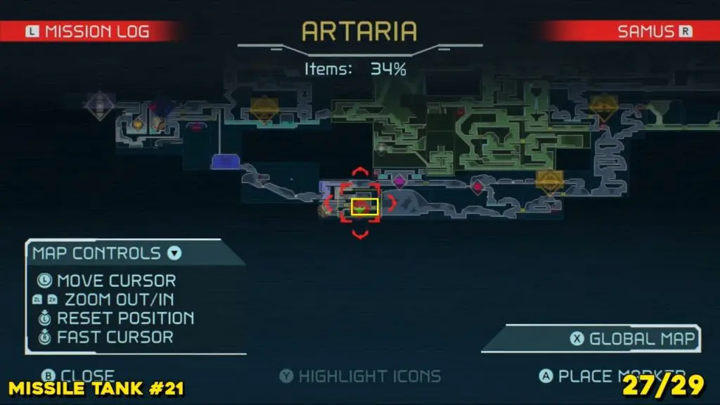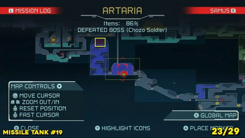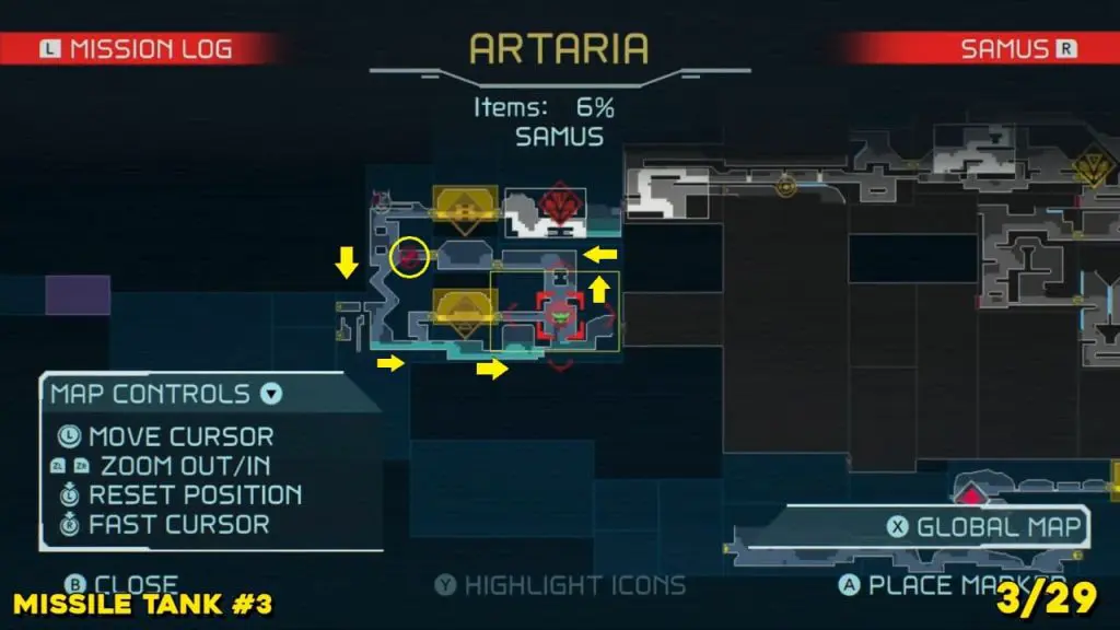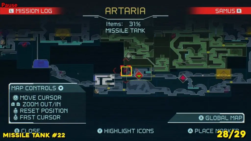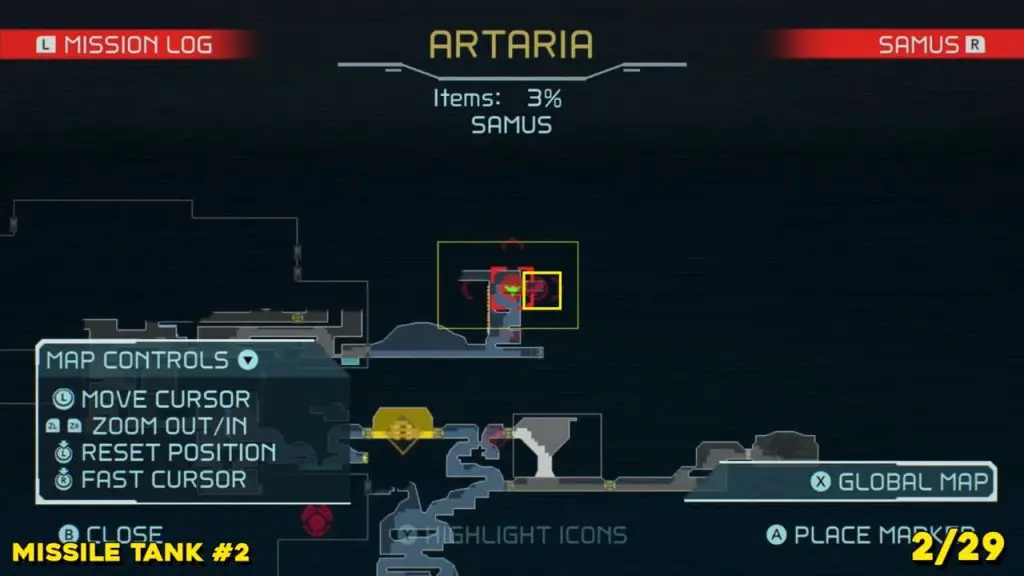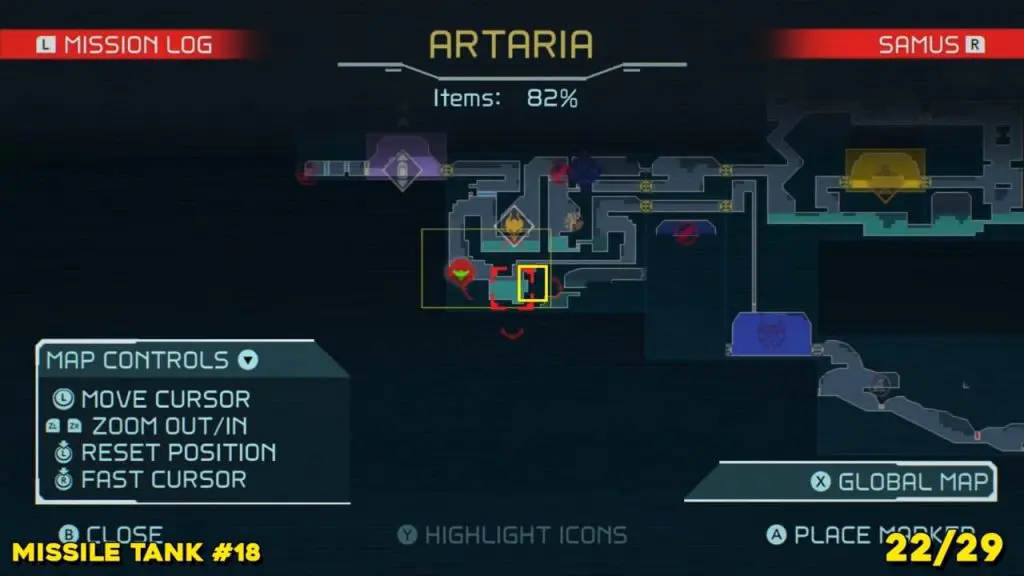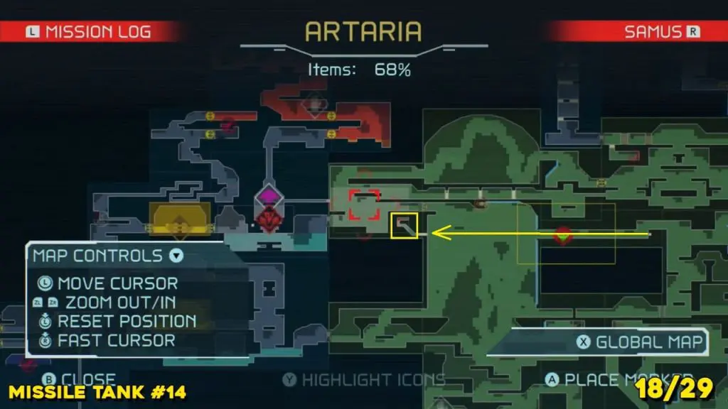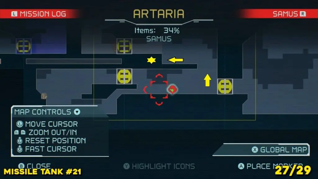 Located in the middle of Artaria’s now green E.M.M.I zone as pointed on the map. This Missile tank is behind a magnetic barrier. Use a grapple beam to lift the barrier.