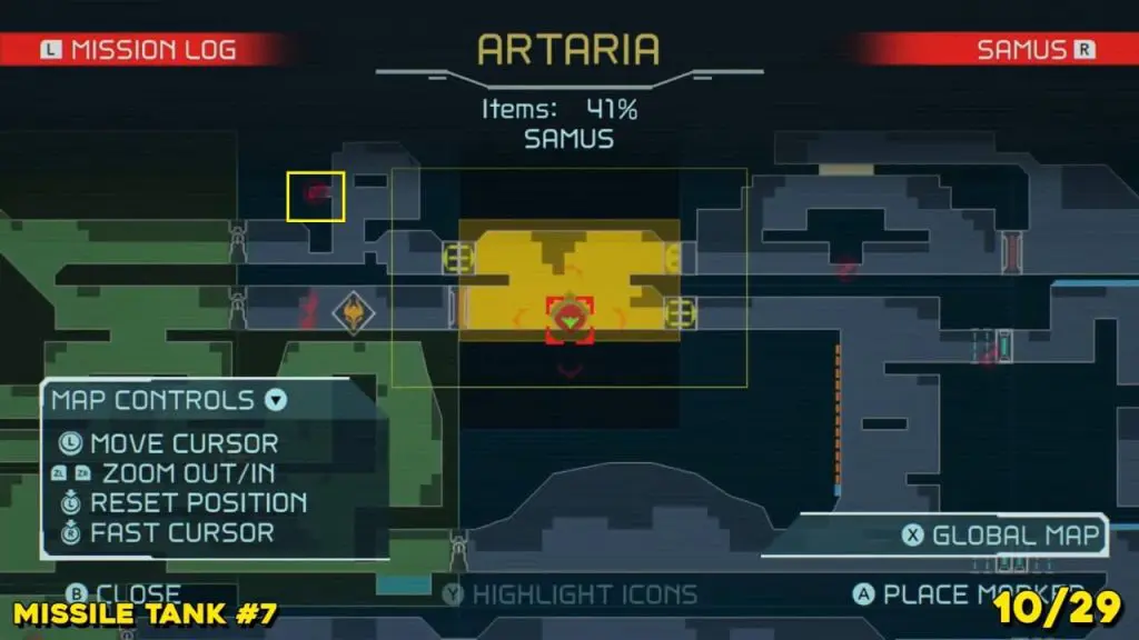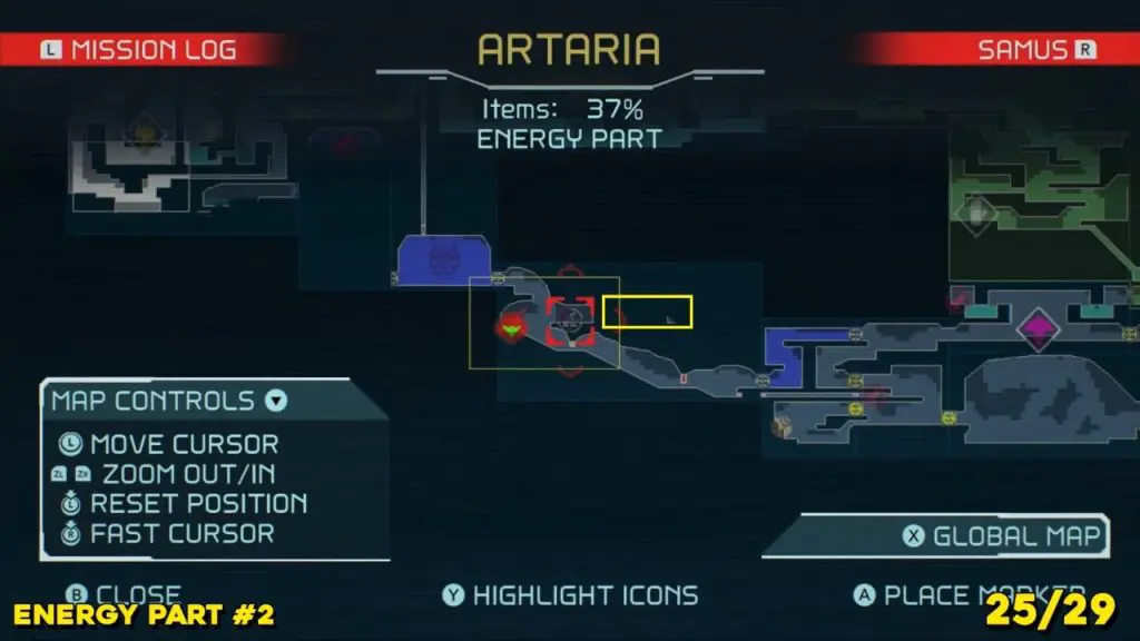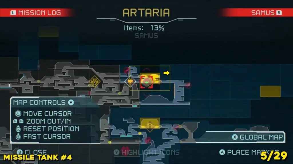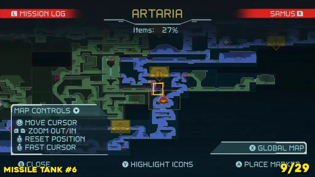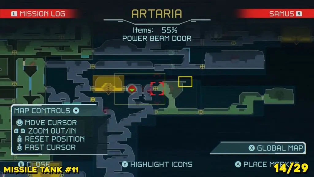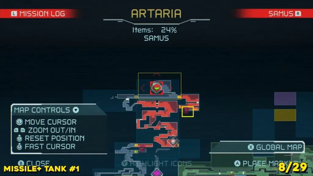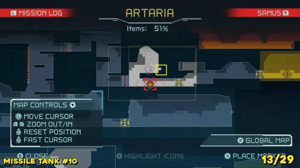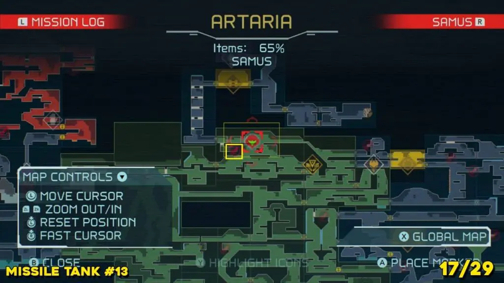 It is in the area in the far east of Artaria’s map now after taking an elevator from Cataris. Simply jump off the elevator and head left to enter the hot area we’ve indicated below. Ride the magnet pad on the ceiling across the room and you’ll be able to jump off right on top of this next prize.