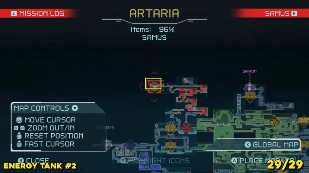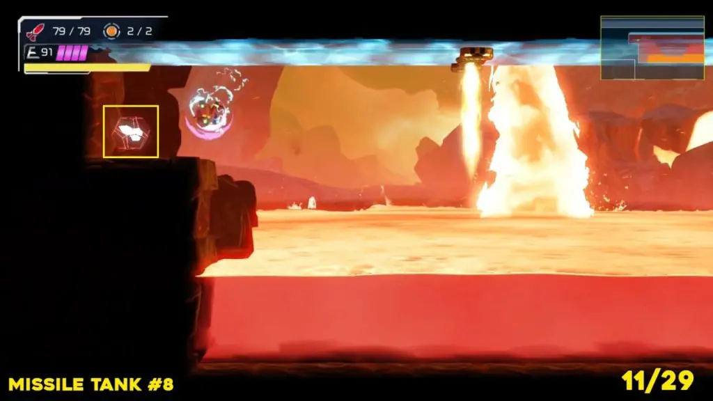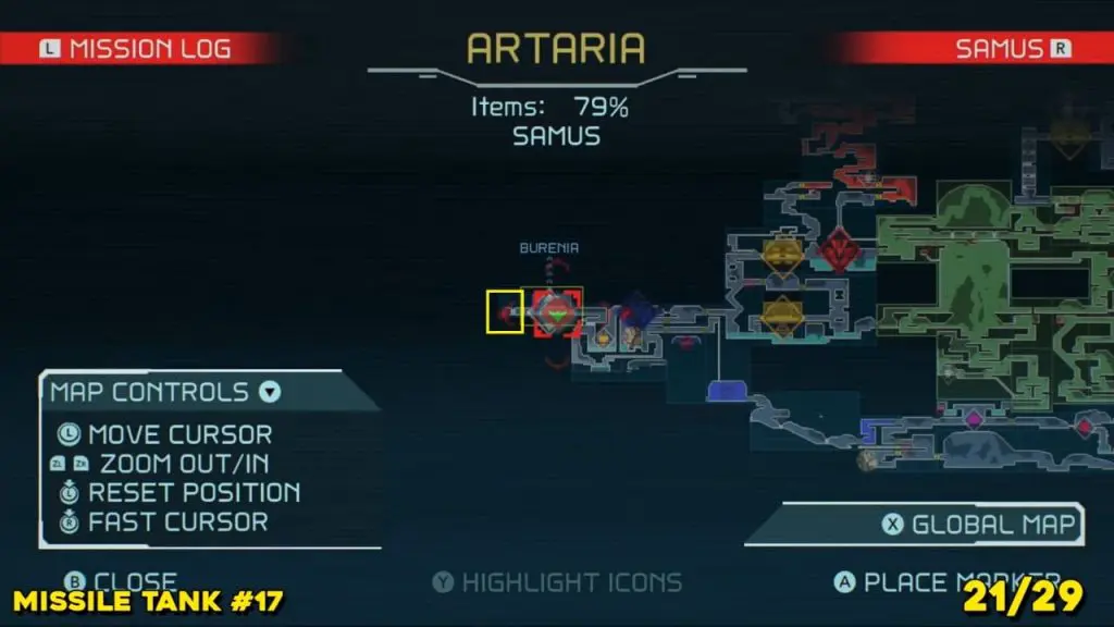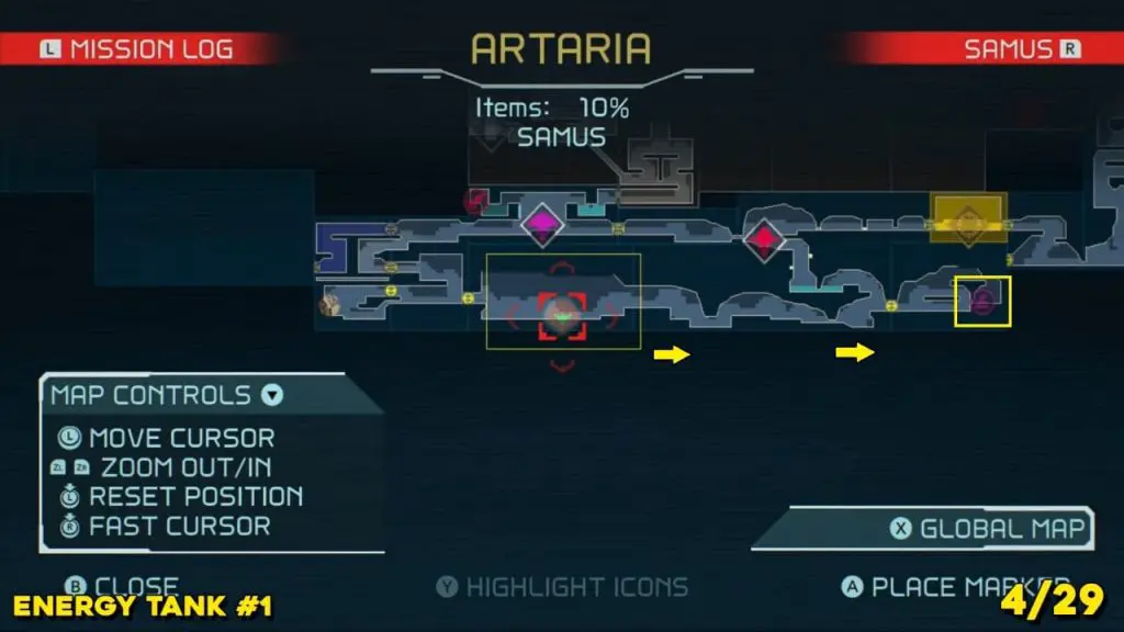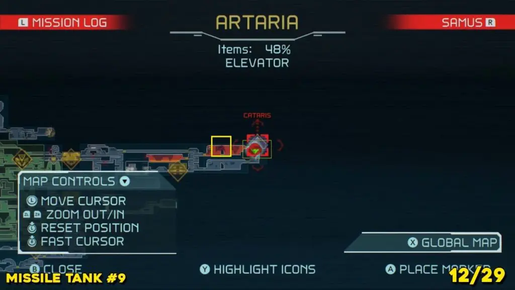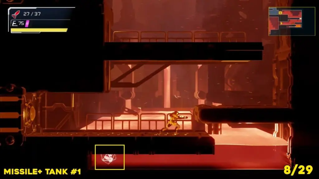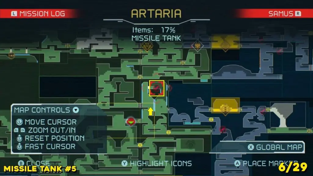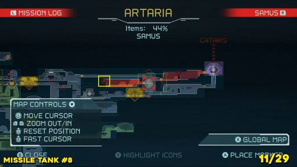 It is in the area in the far east of Artaria’s map now after taking an elevator from Cataris. Simply jump off the elevator and head left to enter the hot area we’ve indicated below. Ride the magnet pad on the ceiling across the room and you’ll be able to jump off right on top of this next prize.