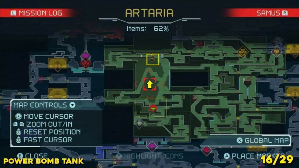 Power Bomb Tank can be found right at the top of a huge area in Artaria (green E.M.M.I zone). You’ll need to spin jump your way right up to the top and attach to the nearby magnetic strip in order to get it. Eliminate any nearby flying enemies so they can’t knock you down.