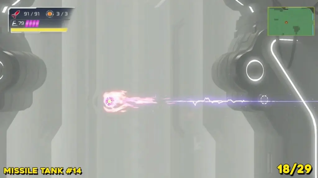 The missie tank is in the green E.M.M.I zone. Here, you must run straight down the long corridor marked on the map from the right. Charge your speed boost, activate shinespark, and enter the small block space at the end in morph ball form. While still in morph ball form and shinesparking, quickly press B to ballspark and then left. You’ll take off like a bullet, cross the chasm, and blow all the speed blocks on the other side away, freeing up your upgrade.