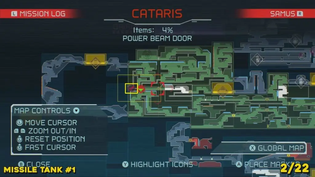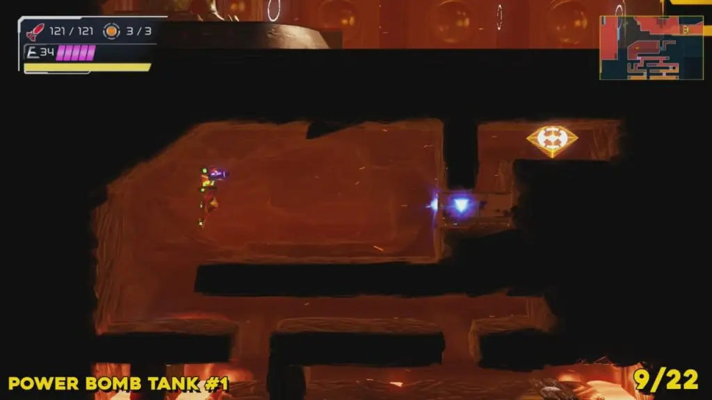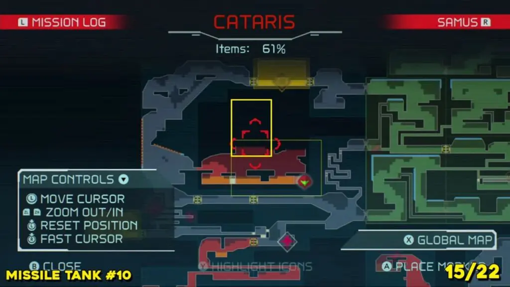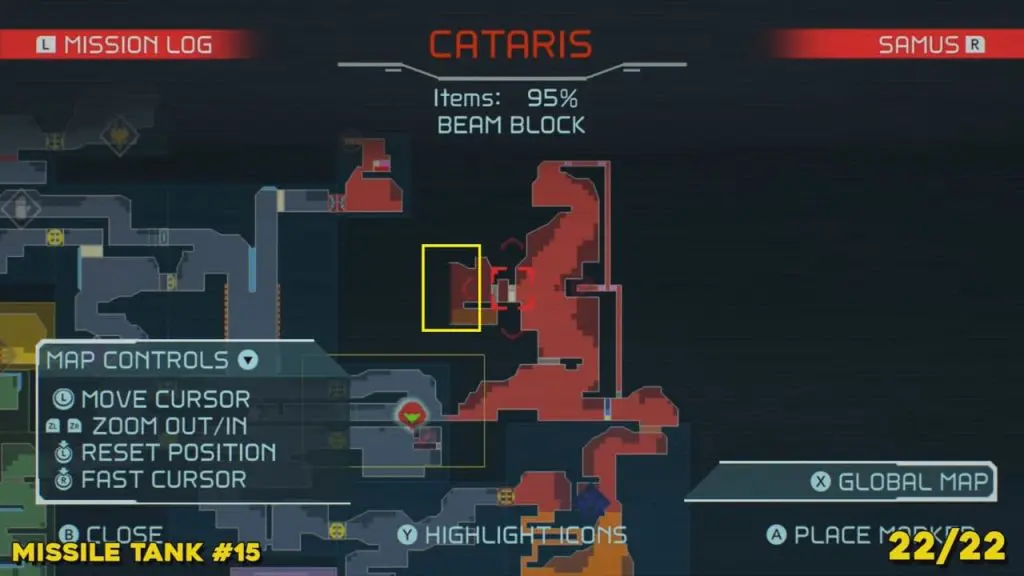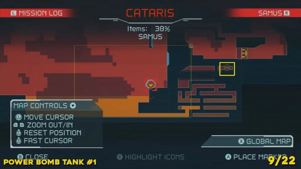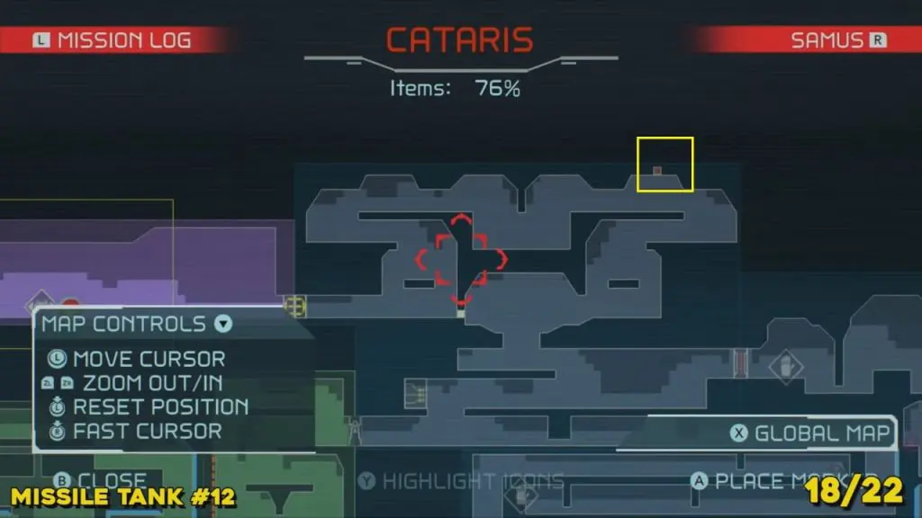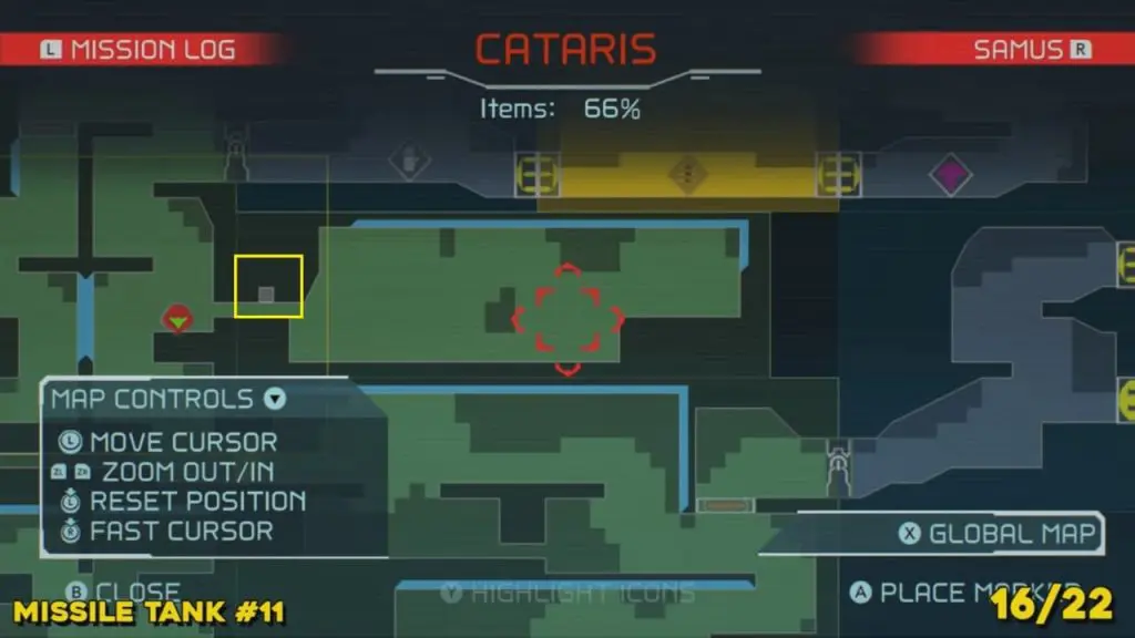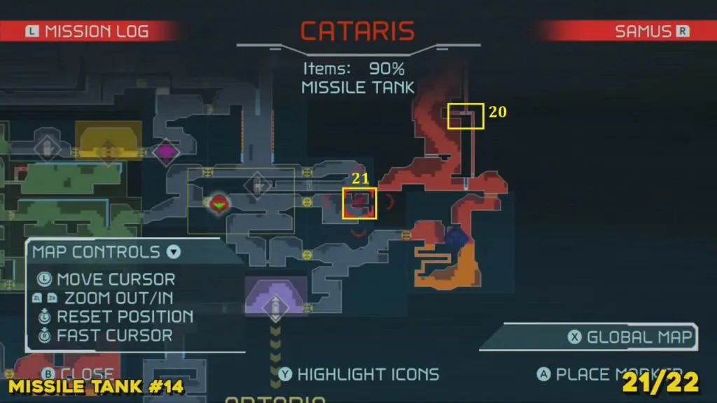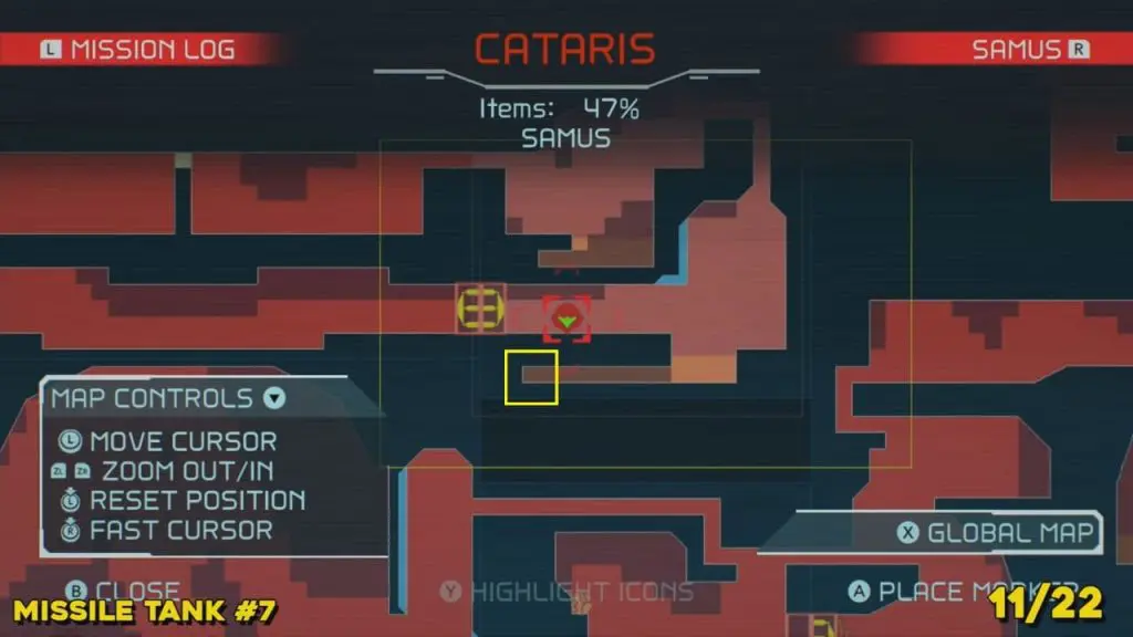 You’ll need your Varia Suit for this next one. From the Network Station on the northwest side of Cataris, go to the right and then below as marked on the map. Once you reach the lava room, climb up the ledges and hang from the blue panel. Blast the block on the left wall. You will find the tank at the upper left platform.