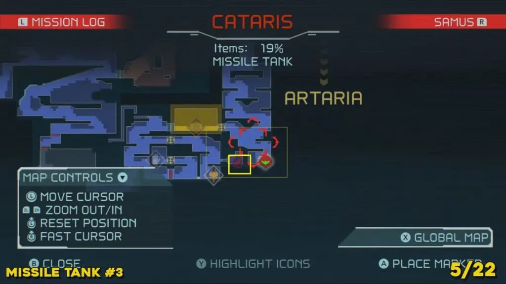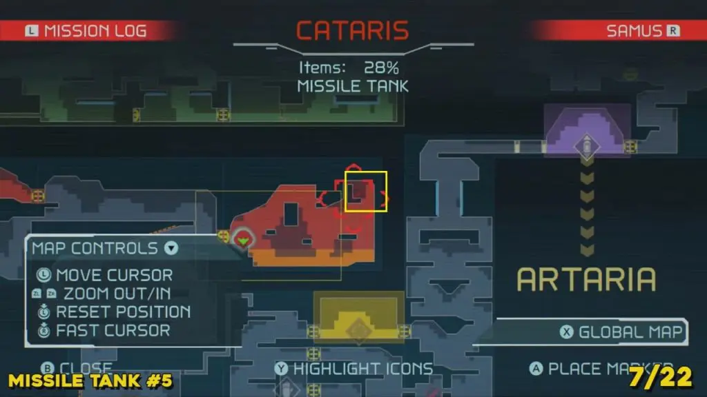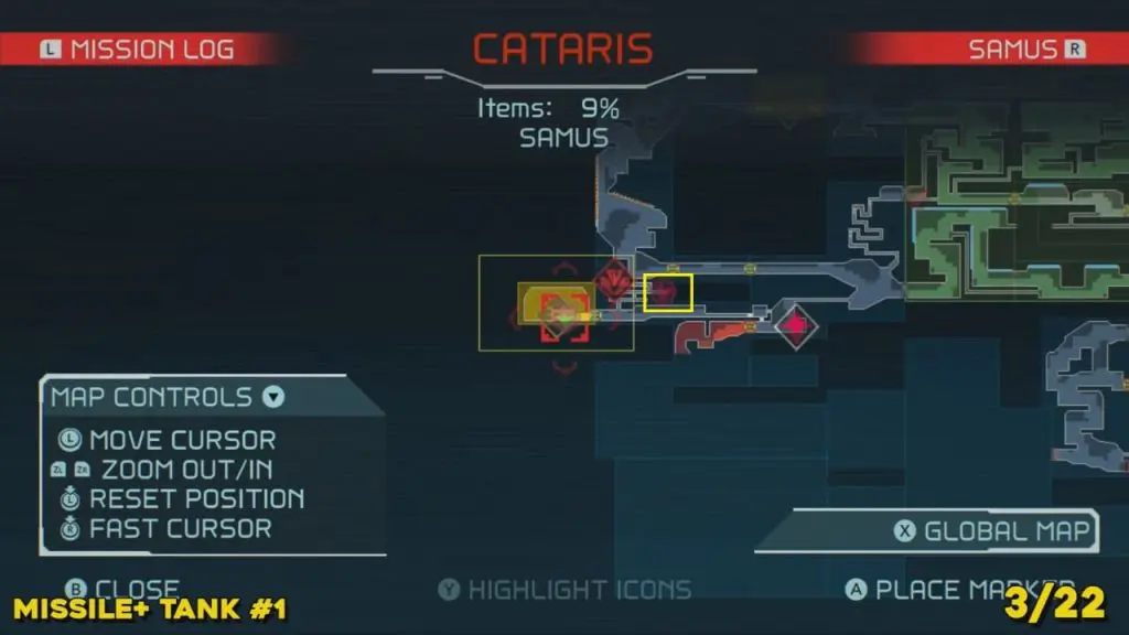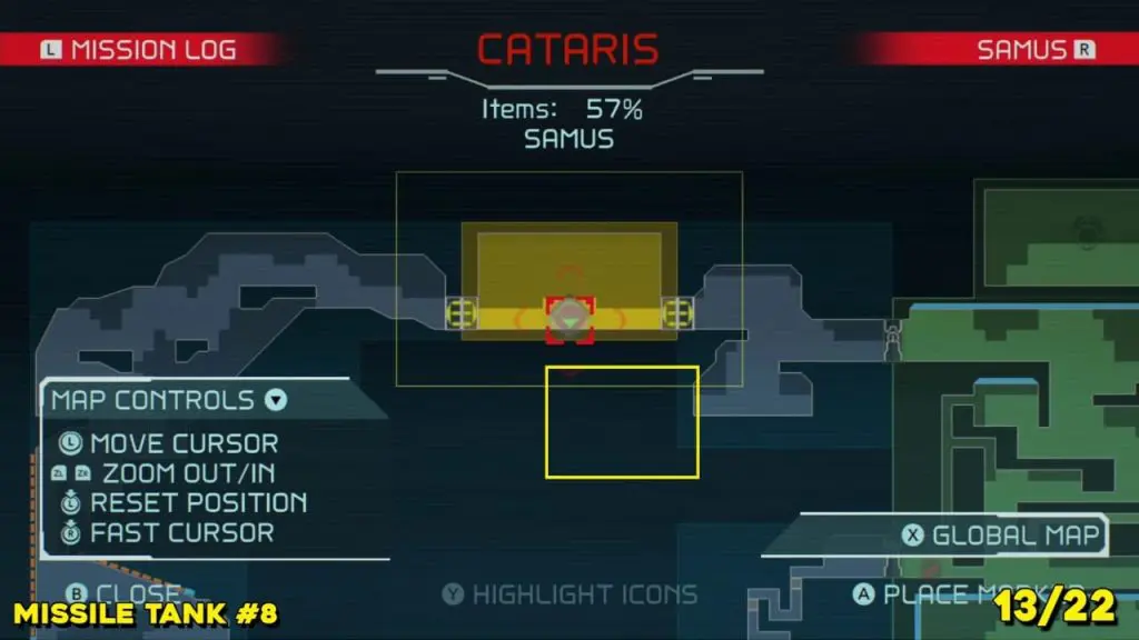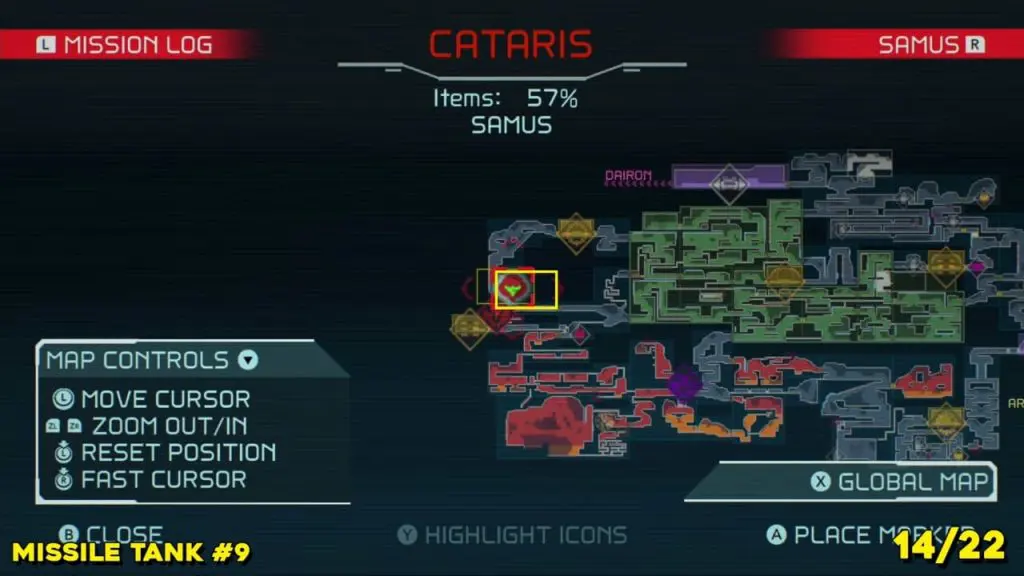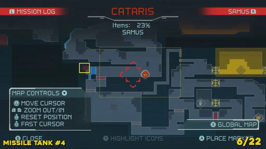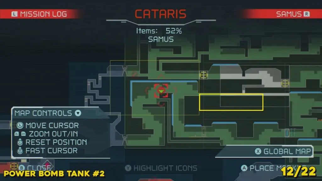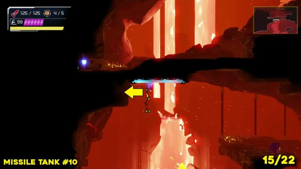 You’ll need your Varia Suit for this next one. From the Network Station on the northwest side of Cataris, go to the right and then below as marked on the map. Once you reach the lava room, climb up the ledges and hang from the blue panel. Blast the block on the left wall. You will find the tank at the upper left platform.