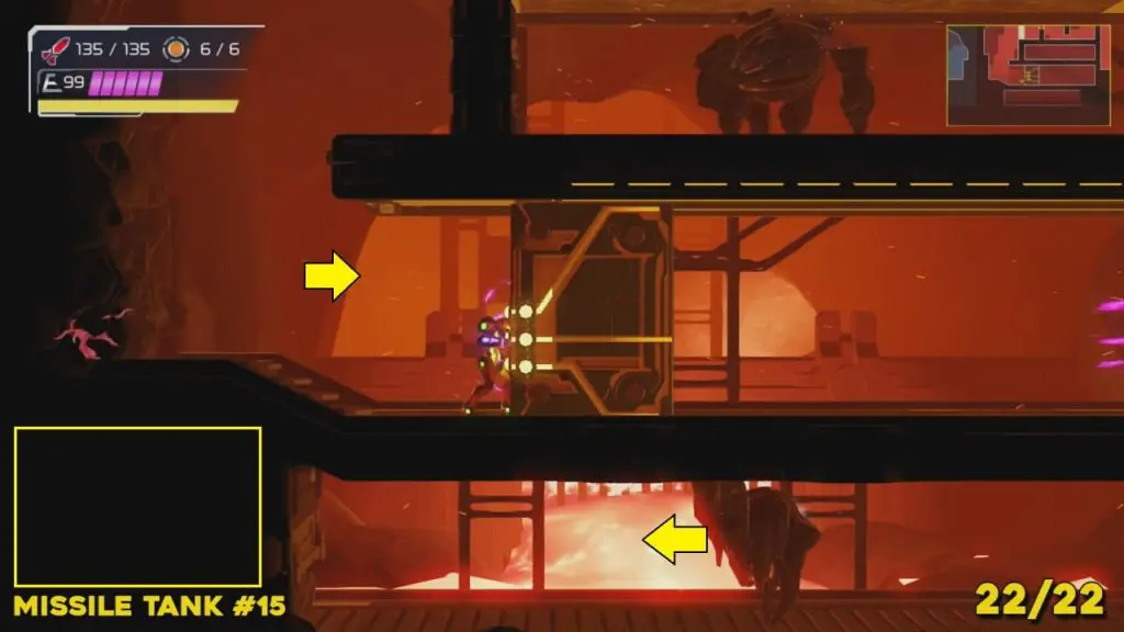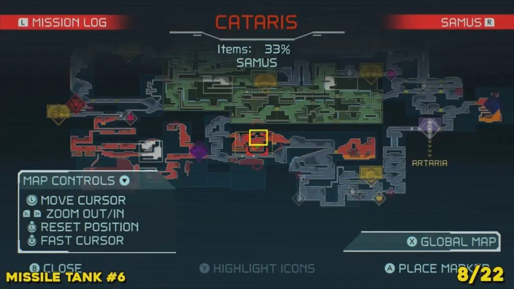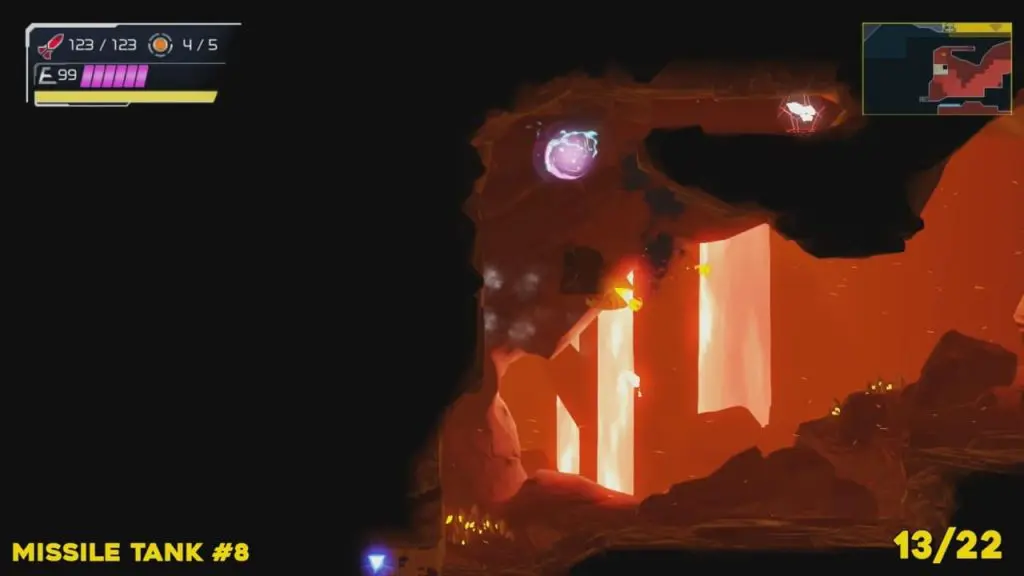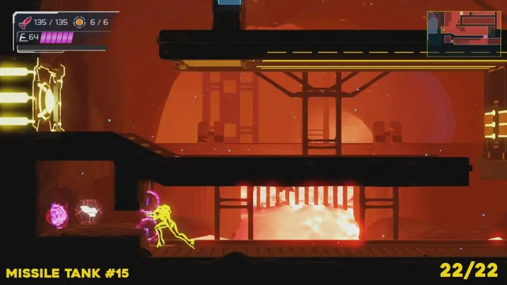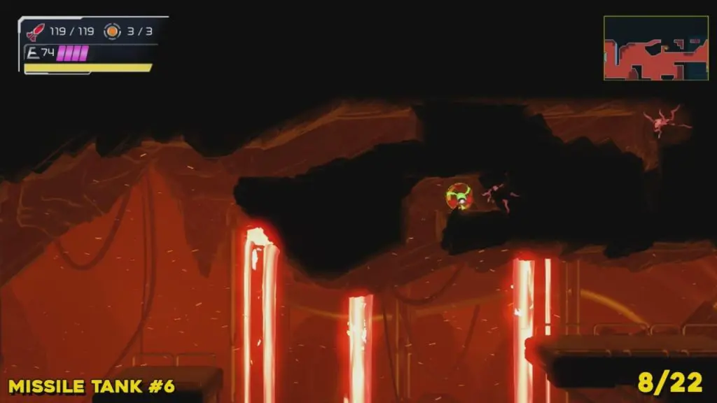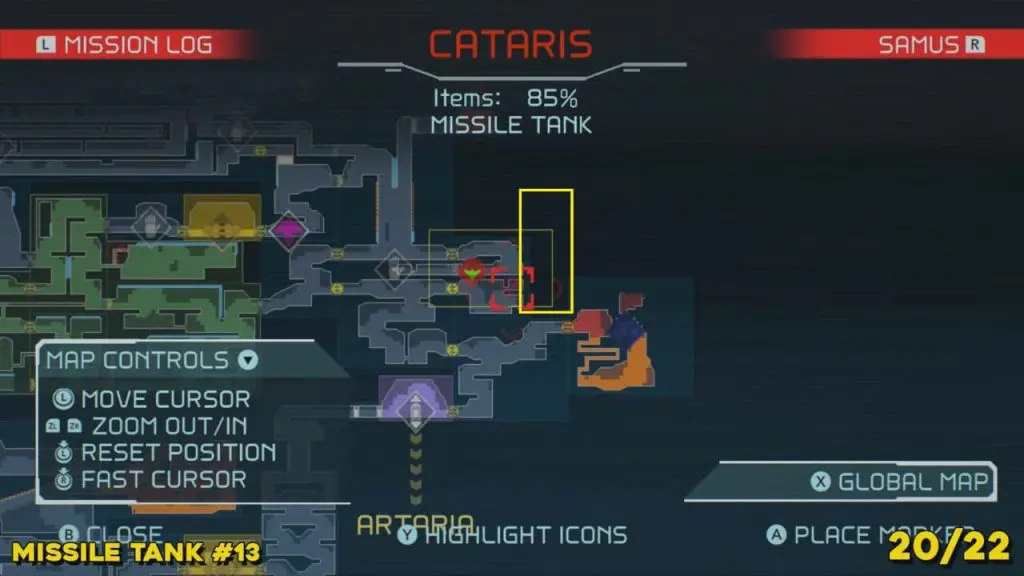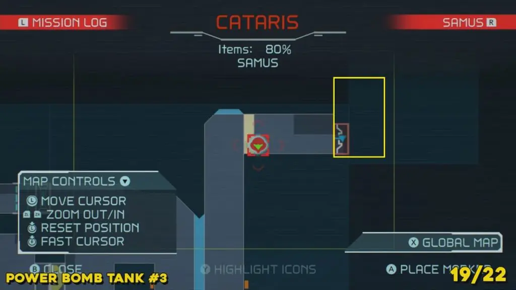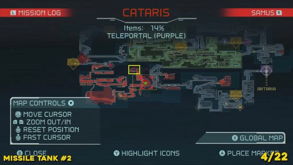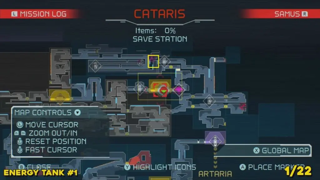 You’ll need your Varia Suit for this next one. From the Network Station on the northwest side of Cataris, go to the right and then below as marked on the map. Once you reach the lava room, climb up the ledges and hang from the blue panel. Blast the block on the left wall. You will find the tank at the upper left platform.